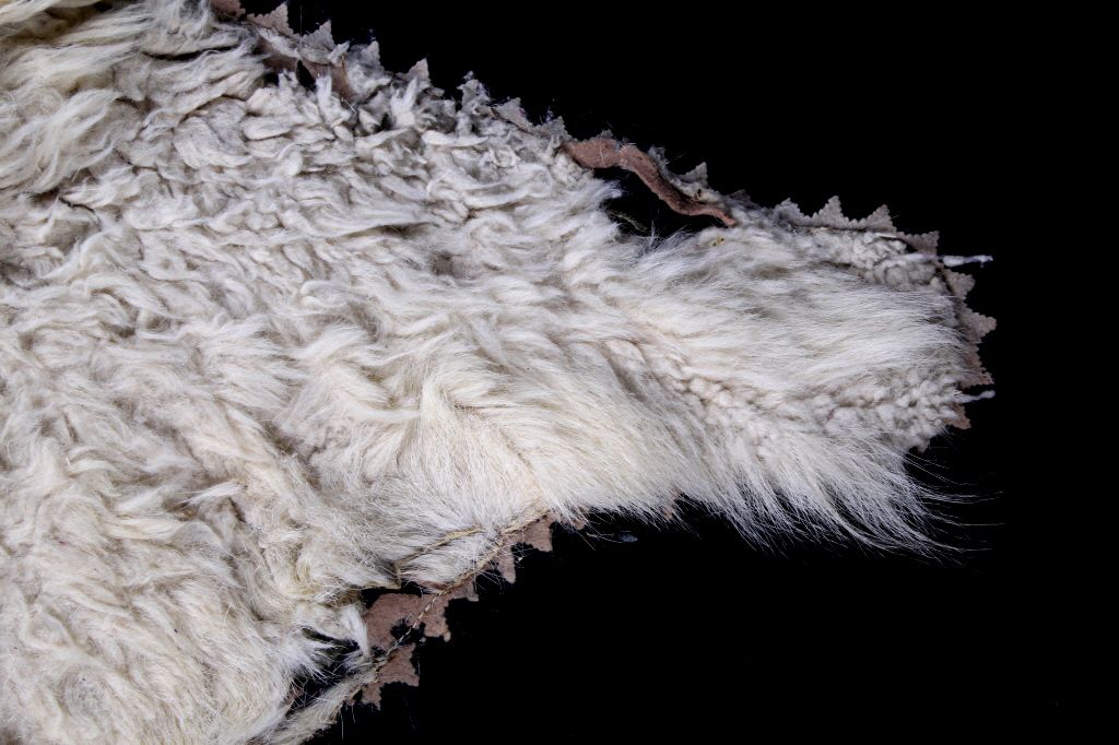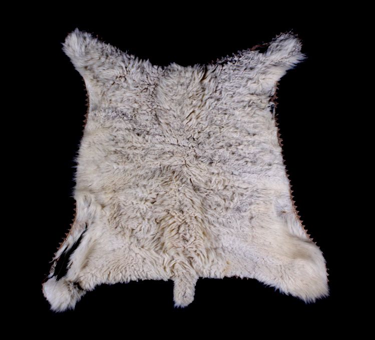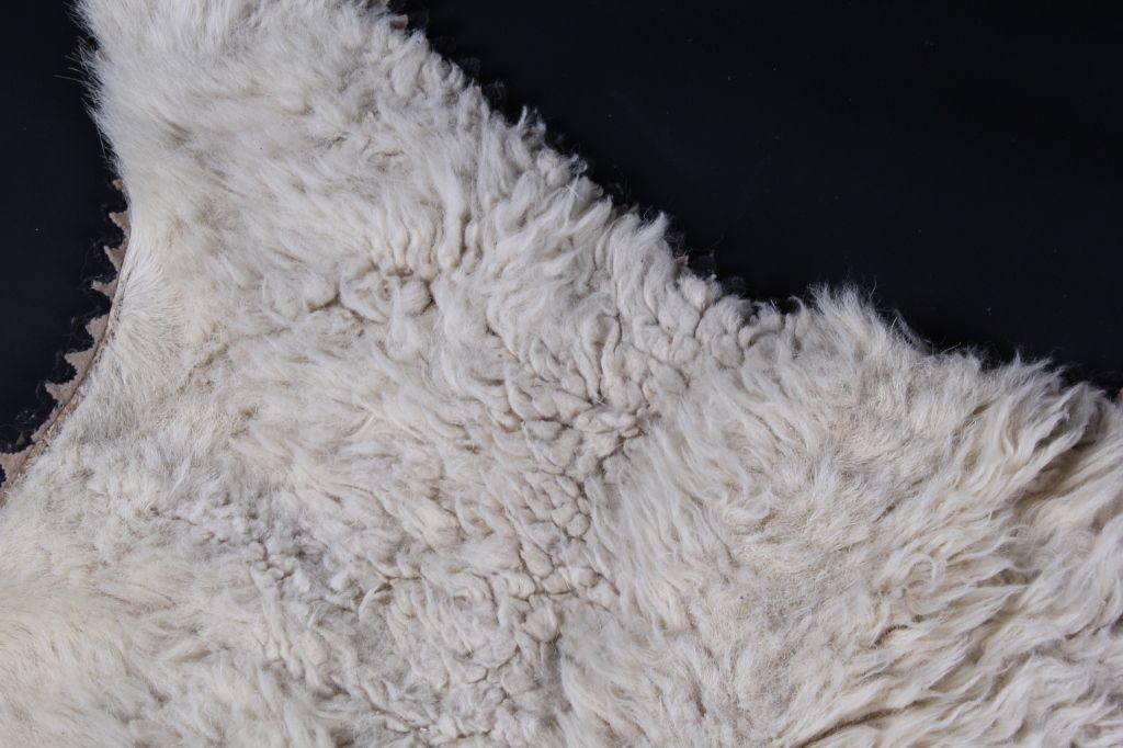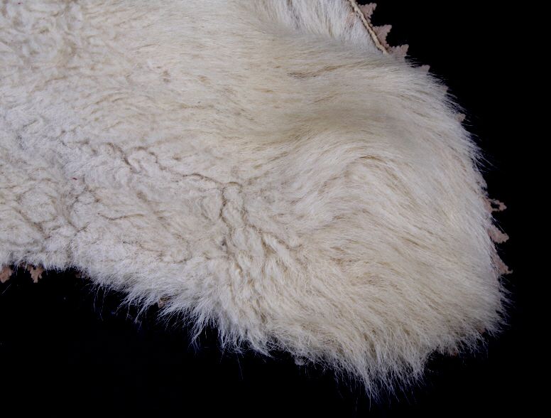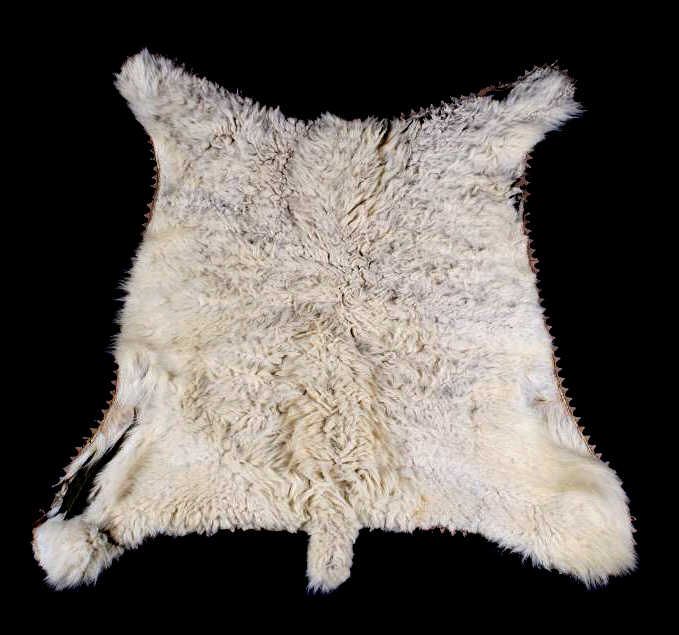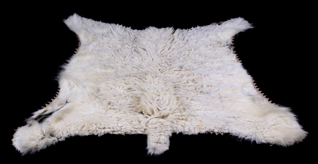 This is a Montana taken Mountain Goat rug. This piece is of vintage age and shows a double felted bottom. The fur shows some matting and edge cracking, but overall a great piece. Measures 41"x46"