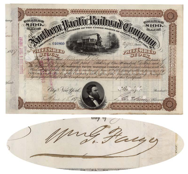 1879, New York. Stock certificate for two hundred and ninety shares issued to and signed on attached transfer by WILLIAM G. FARGO (1818 - 1881). Expressman. Fargo got his start in the express business at age 13 through a 30 mile mail route. Sometime later, William Fargo served as a messenger with Wells & Company, the first express company to venture west of Buffalo. Fargo became a partner in Wells & Company and, in 1850, they joined with two other express companies to form the American Express Company which covered the eastern sector of the United States. Brown / Black. Vignette of a locomotive at top center. Vignette of Frederick Billings at bottom center. Stamp and punch cancellations do not affect Fargo’s signature. Minor toning at edges. Else Extremely Fine.