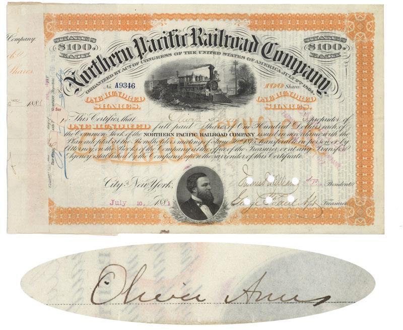 1881, New York. Stock certificate for one hundred shares issued to and signed on verso by OLIVER AMES (1831-1895) U.S. political figure, governor of Massachusetts. Oliver Ames was the some of Oakes Ames, a congressman who was impeached in the Credit Mobilier scandal. Orange / Black. Vignette of locomotive at top center. Vignette of Frederick Billings at bottom center. Punch and stamp cancellations do not affect Ames’ signature. Extremely Fine.