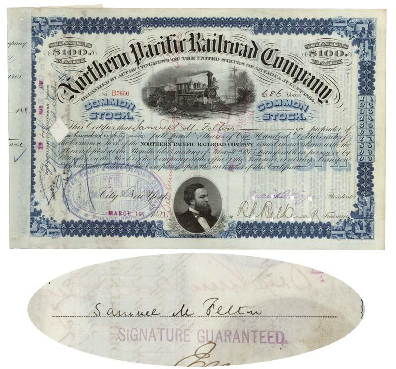1881, New York. Stock certificate for six hundred and eight shares issued to and signed on verso by SAMUEL M. FELTON President of the Philadelphia, Wilmington and Baltimore Railroad. During the Civil War, Felton ensured that the line was able to run despite Confederate attacks. Felton also played a key part in foiling an attempt to assassinate President Lincoln by hiring Allan Pinkerton to infiltrate the Maryland Secessionists. Learning that the men planned to kill Lincoln during a stop in Baltimore, Felton and others devised a plan to provide secret transportation for Lincoln directly from Philadelphia to Washington. Blue/Black. Vignette of locomotive at top center. Vignette of Frederick Billings at bottom center. Punch and stamp cancellations do not affect Felton’s signature. Very Fine.