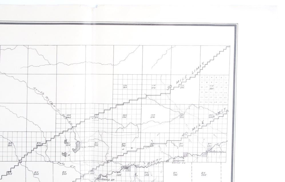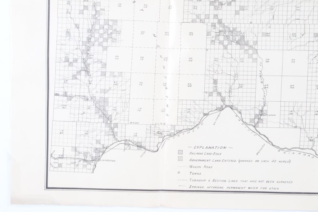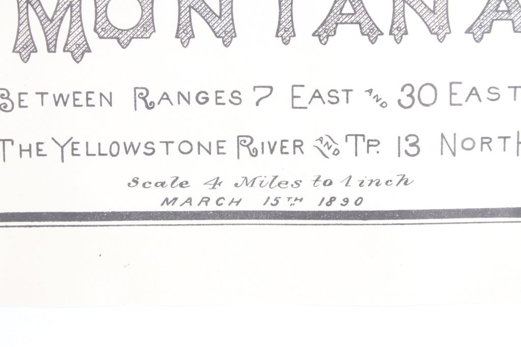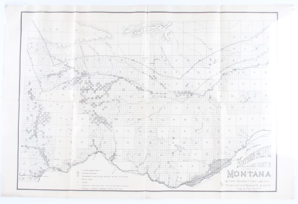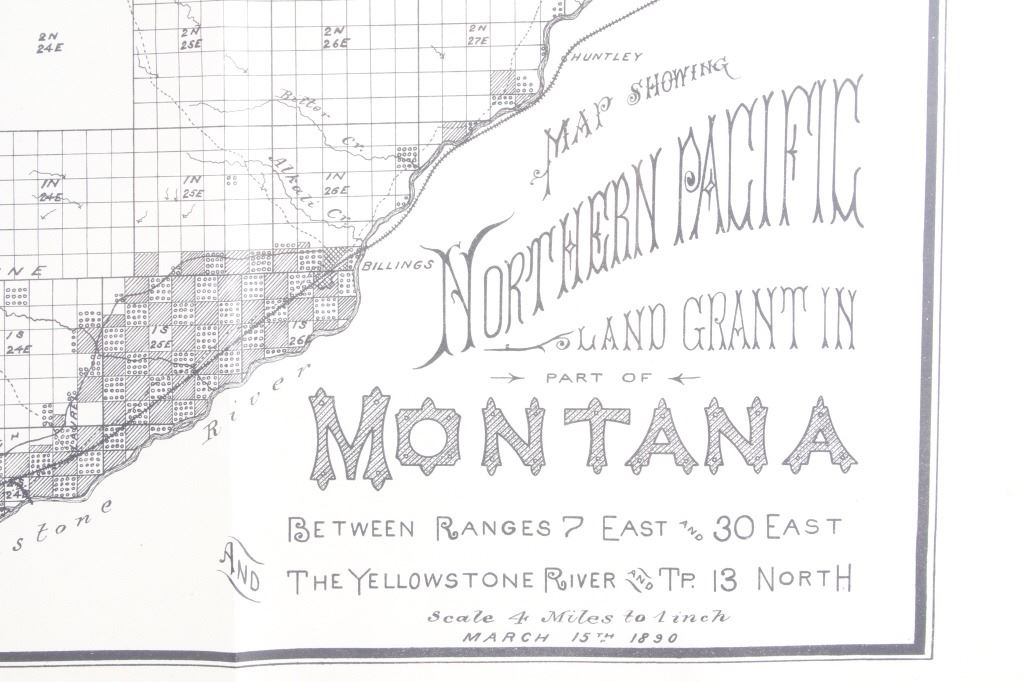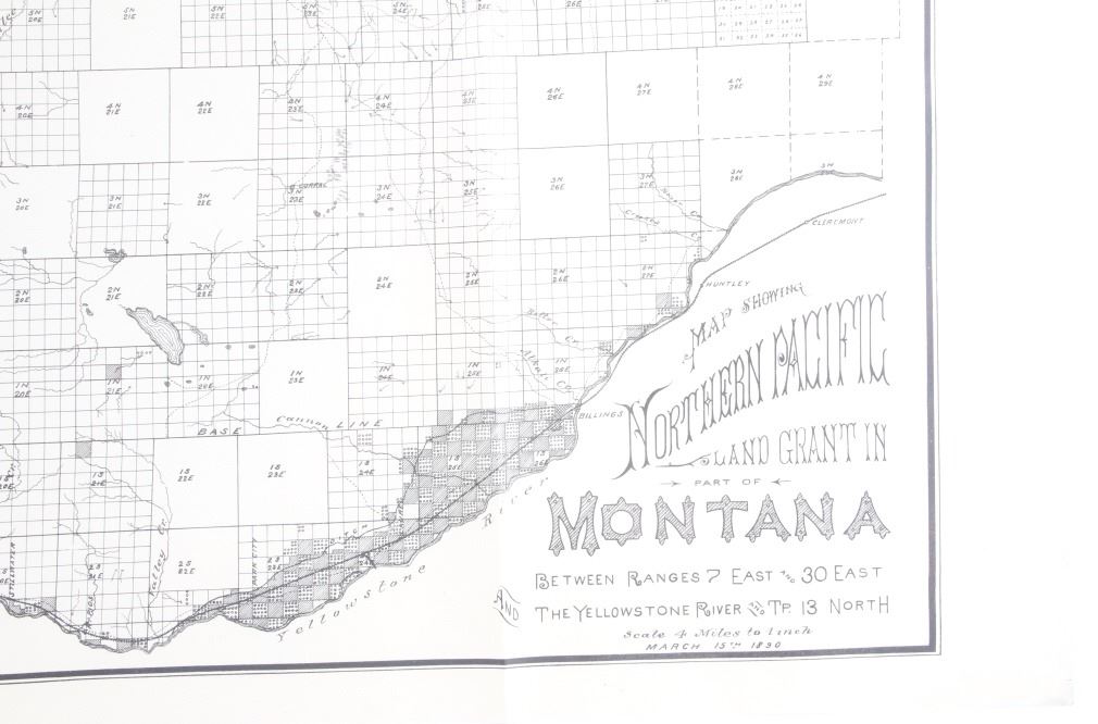 Featured in this lot is this Northern Pacific land grant Montana Map circa 1890. The map features the plot map of part of Montana and reads as follows: Map Showing Northern Pacific Land Grant in part of Montana Between Ranges 7 East and 30 East and The Yellowstone River and Tp. 13 North - scale 4 Miles to 1 inch - March 15th 1890. The condition of this map is good with some slight wear to the bottom left hand corner and to the top right hand corner but otherwise is in good overall condition. The measurements of this map are 25" x 37 1/2".