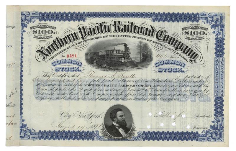 1878, New York. Stock certificate for four hundred and five shares issued to THOMAS ALEXANDER SCOTT (1823-1881) President of the Pennsylvania Railroad, at the time the largest corporation in the world. In addition, Scott took a leading role in crafting what became the Compromise of 1877. Blue / Black. Vignette of locomotive at top center. Vignette of Frederick Billings at bottom center. Punch cancelled.