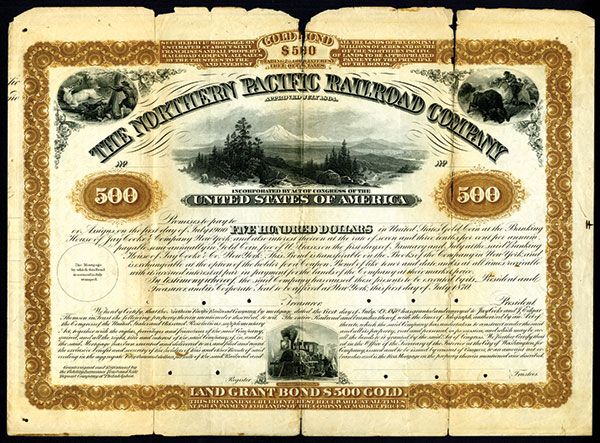 1870, $500 7 3/10% Gold Specimen Bond. Payable at the Banking House of Jay Cooke. Black print with brown border. Impressive mountain, trees, lake and city panorama with hunting scenes in the upper corners and locomotive bottom center. Good condition with splitting and staining but unique in archive and impossible to improve upon. ABNCo. First Issue Bond by this historic railroad only known by Proof certificates and also an unknown denomination and design for issue in Cox.