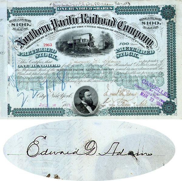 1880, New York. Northern Pacific Railway Stock certificate for 100 shares issued to and signed on verso by Edward D. Adams. Orange/Black. Attractive certificate with ornate border, vignette of a train passing by telegraph lines in the countryside and a lower vignette of Fredrick Billings. Star punch and stamp cancelled. Very fine.