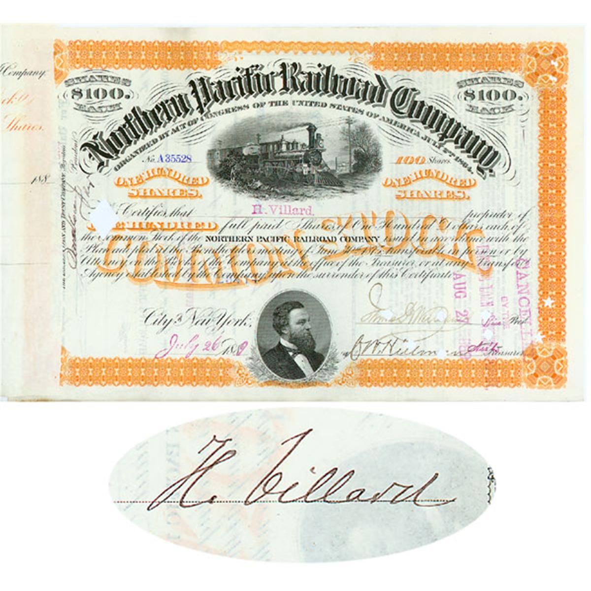 1889, New York. Stock certificate for 100 shares. OrangeBlack. Engraved vignette of a steam locomotive at top center, nice portrait vignette of Frederick Billings at bottom. Issued to and signed on verso by HENRY VILLARD. Punch cancellation does not effect Villard's signature.