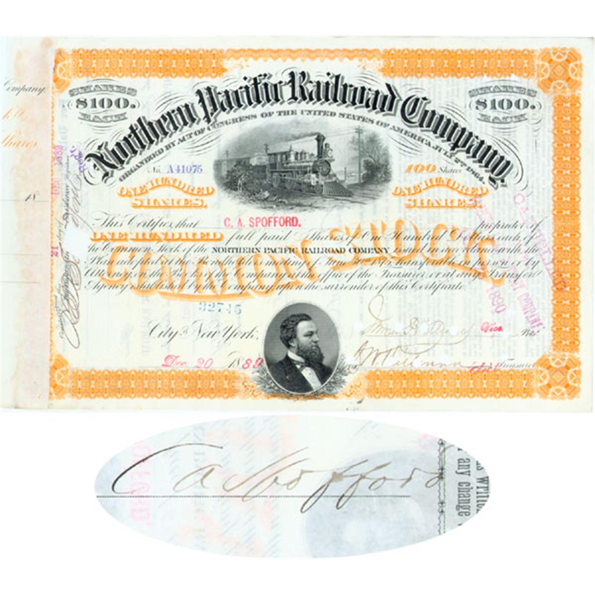 1889, New York. Stock certificate for 100 shares. Orange/Black. Engraved vignette of a steam locomotive at top center, nice portrait vignette of Frederick Billings at bottom. Issued to and signed on verso by C.A. Spofford. Punch and stamped cancelled.