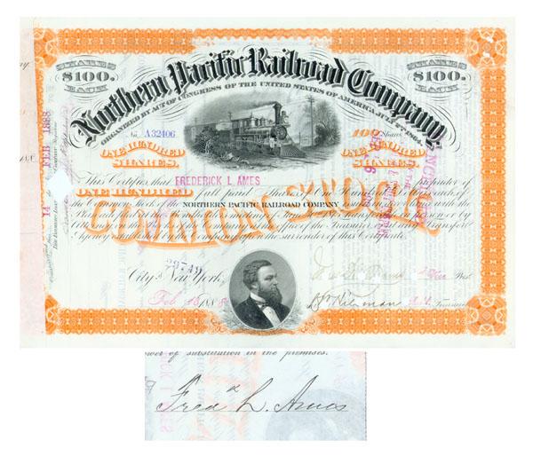 1888, New York Stock certificate for 100 shares. Orange/Black. . Engraved vignette of a steam locomotive at top center, nice portrait vignette of Frederick Billings at bottom. Issued to and signed on verso by Frederick L. Ames.