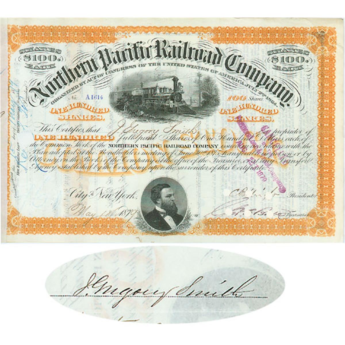 1879, New York. Stock certificate for 100 shares. Orange/Black. Engraved vignette of a steam locomotive at top center, nice portrait vignette of Frederick Billings at bottom. Issued to and signed on verso by J. Gregory Smith. Punch and stamped cancelled. J. GREGORY SMITH. Railroad president, one of the distinguished War Governors of Vermont, and a conspicuous figure for many years in political and railway circles.