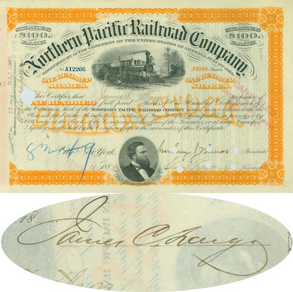 1882, New York. Stock certificate for 100 shares. OrangeBlack. Engraved vignette of a steam locomotive at top center, nice portrait vignette of Frederick Billings at bottom. Issued to and signed on verso by JAMES C. FARGO (1829-1915). Expressman. Working along with his older brother, William, co-founder of the American Express Co., James became a prominent figure in the railroad and express industries. He became president of American Express in 1881 upon his brother’s retirement from that position. Light punch and stamp cancellations not affecting Fargo’s signature on verso. Very Fine.