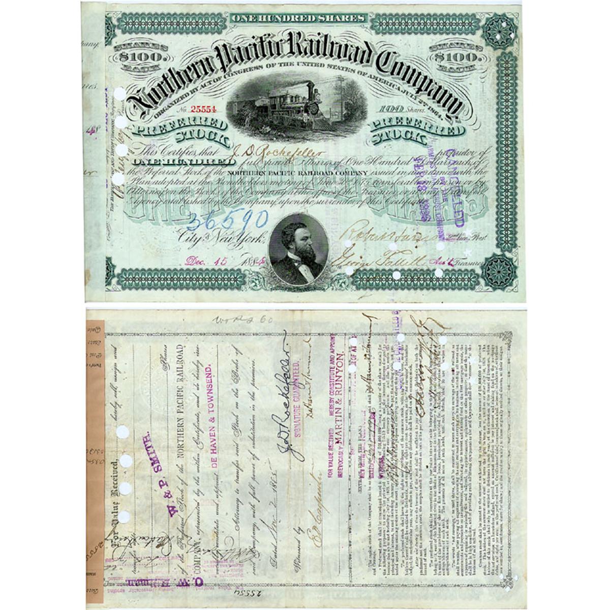 1884, New York. Stock certificate for 100 shares. GreenBlack. Engraved vignette of a steam locomotive at top center, nice portrait vignette of Frederick Billings at bottom. Issued to and signed on verso by JOHN D. ROCKEFELLER.