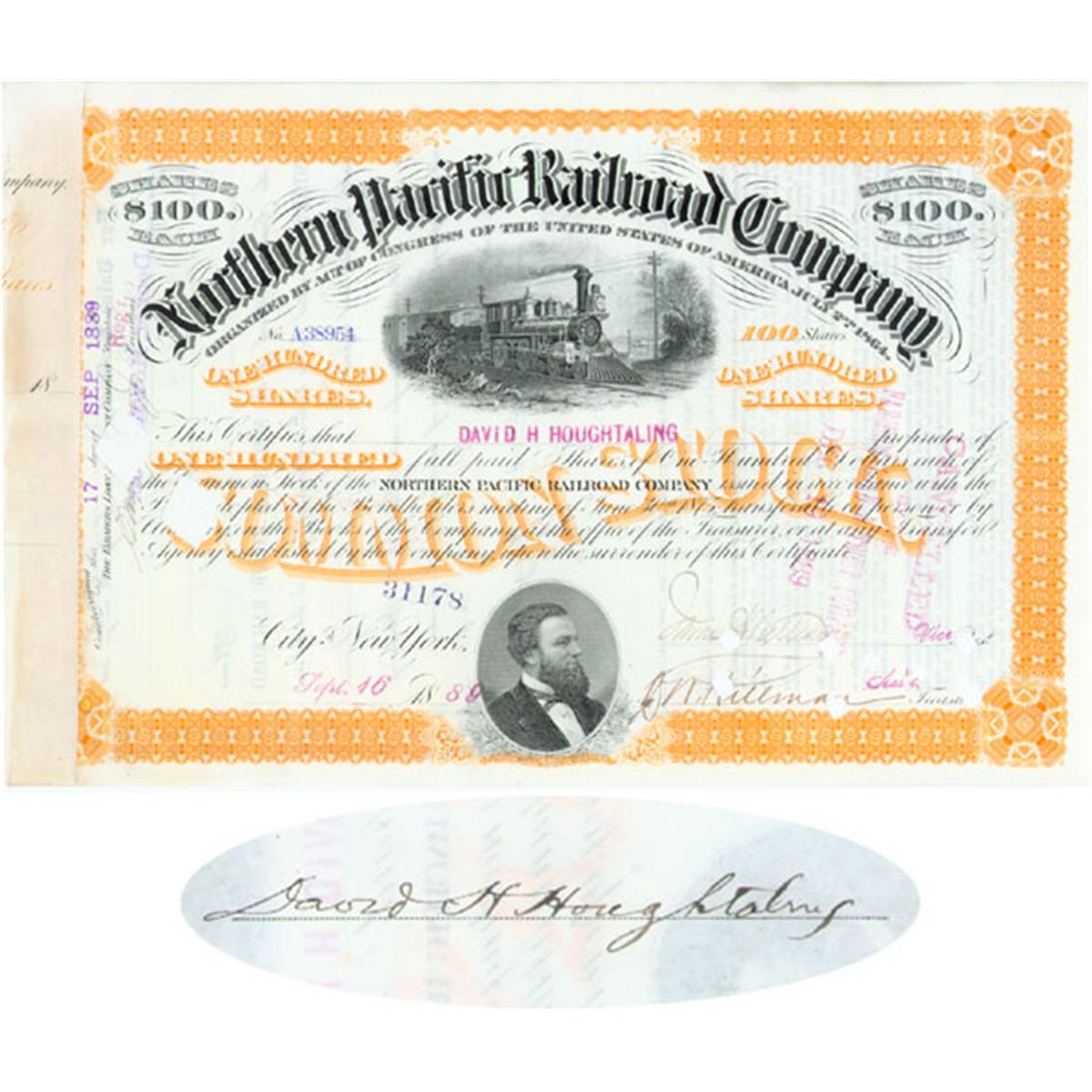 1889, New York. Stock certificate for 100 shares. OrangeBlack. Engraved vignette of a steam locomotive at top center, nice portrait vignette of Frederick Billings at bottom. Issued to and signed on verso by DAVID HOUGHTALING.