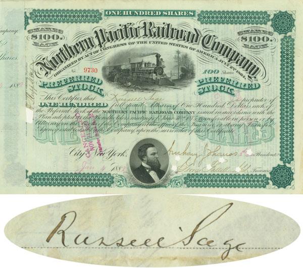 1882, New York. Stock certificate for 100 shares. Green/Black. Engraved vignette of a steam locomotive at top center, nice portrait vignette of Frederick Billings at bottom. Issued to and signed on verso by Russell Sage. Punch and stamped cancelled.