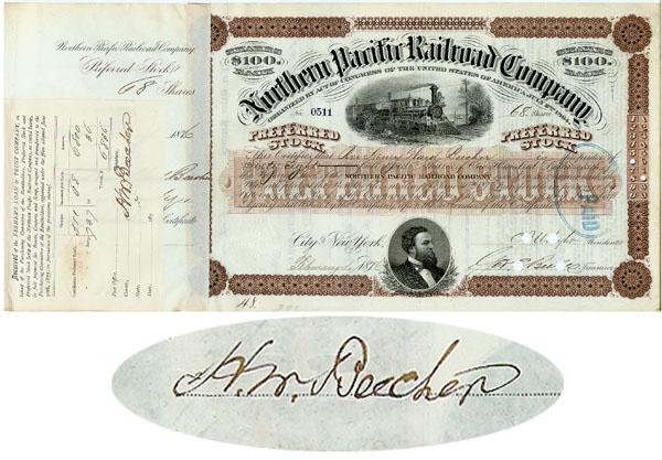 1876, New York. Stock certificate for 68 shares. Issued to and signed on verso and stub by REV. HENRY WARD BEECHER. Stamp and punch cancellations not affecting signature.