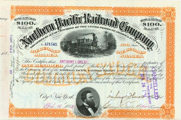 1884, New York. Stock certificate for 100 shares. GreenBlack. Engraved vignette of a steam locomotive at top center, nice portrait vignette of Frederick Billings at bottom. Issued to but not signed by Anthony J. Drexel. Very fine.