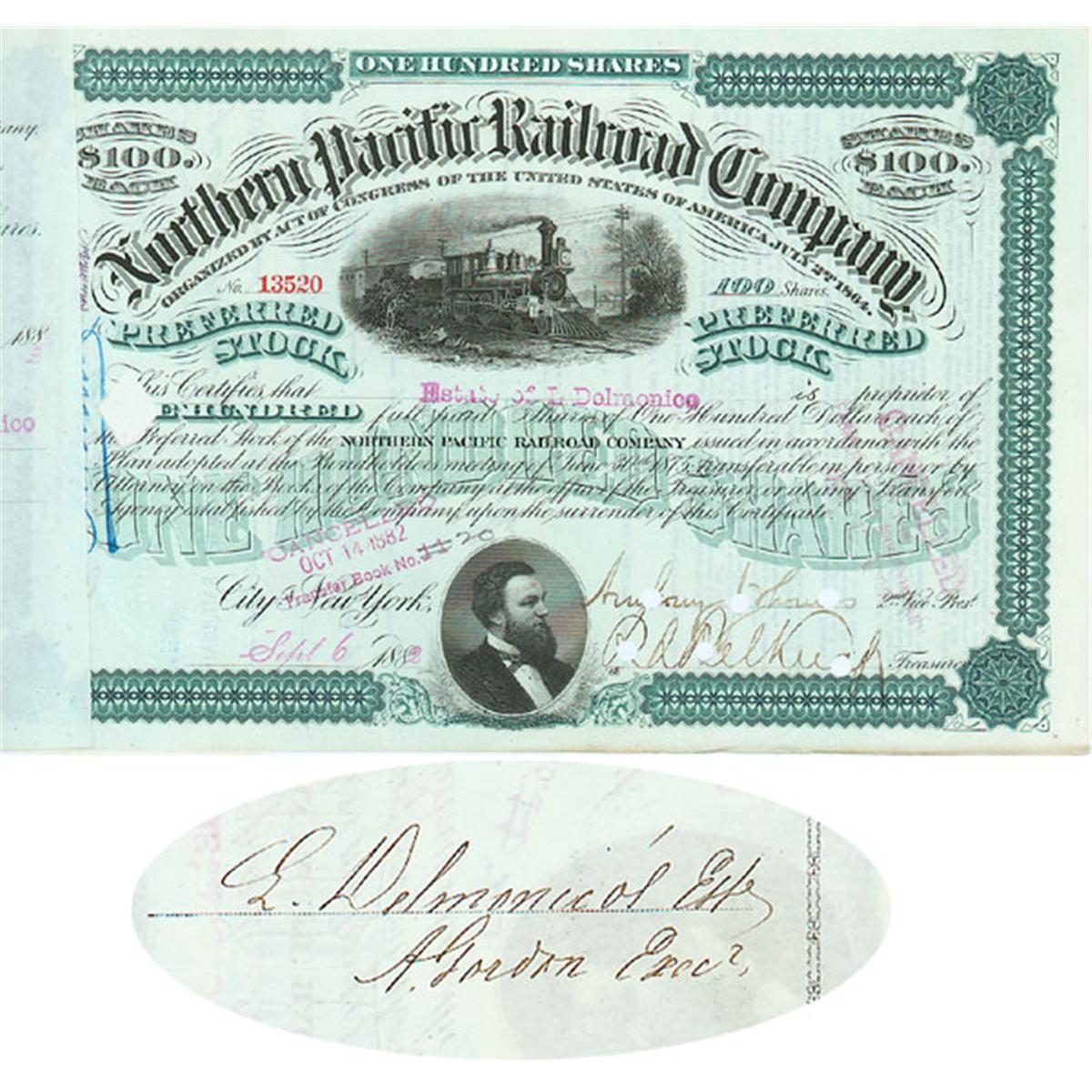 1882, New York. Stock certificate for 100 shares. Green/Black. Engraved vignette of a steam locomotive at top center, nice portrait vignette of Frederick Billings at bottom. Punch and stamped cancelled.