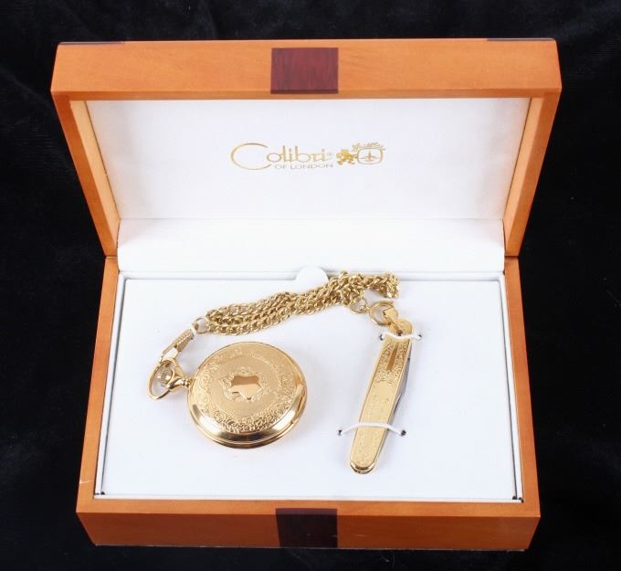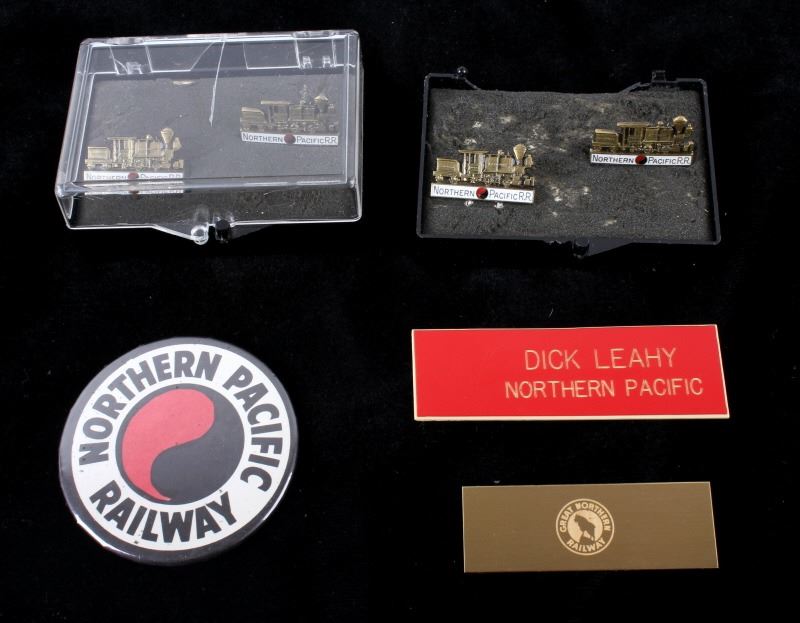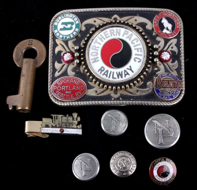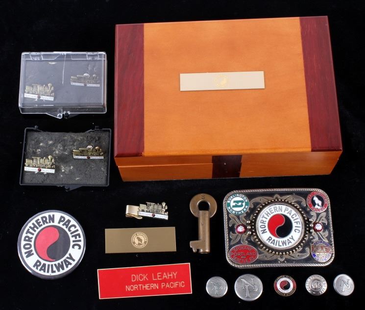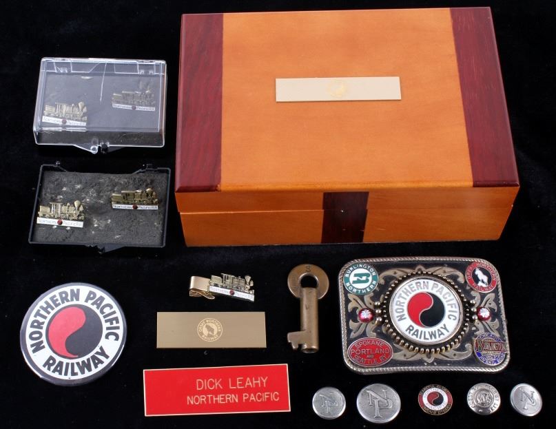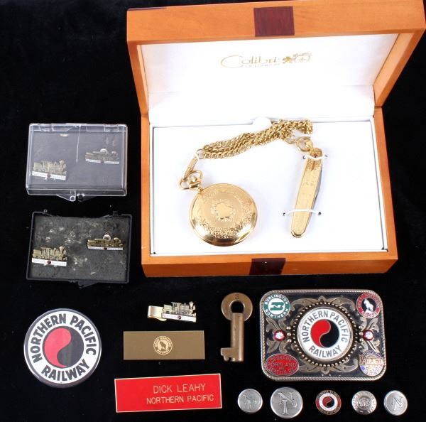 For your consideration we have in this lot a collection of pins, keys, belt buckle, and a pocket watch. The pocket watch comes in a nice presentation box that is marked "Northern Pacific Railway" across the top and marked "Colibri of London" on the interior. The belt buckle shows a large "Northern Pacific Railway" medallion, with four smaller medallions. It also contains a number of Northern Pacific pins. The collection overall is in good condition overall with some slight wear. The watch case 4 3/4" deep by 7" long by 2 1/2" tall.