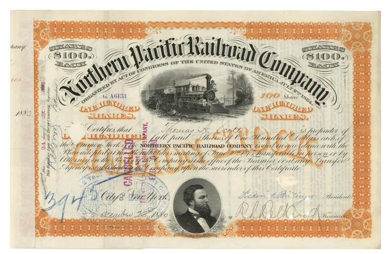 1880, New York. Stock certificate for four hundred and five shares issued to THOMAS ALEXANDER SCOTT (1823-1881) President of the Pennsylvania Railroad, at the time the largest corporation in the world. In addition, Scott took a leading role in crafting what became the Compromise of 1877. Orange / Black. Vignette of locomotive at top center. Vignette of Frederick Billings at bottom center. Stamp and punch cancelled. Punch cancellation affects Billing’s signature. Extremely Fine.