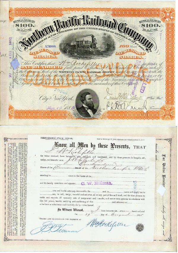 1885, New York. Stock certificate for 100 shares. OrangeBlack. Engraved vignette of a steam locomotive at top center, nice portrait vignette of Frederick Billings at bottom. Issued to and signed by William Rockefeller on verso. Punch and stamp cancellations not affecting Rockefeller's signature. Very Fine.