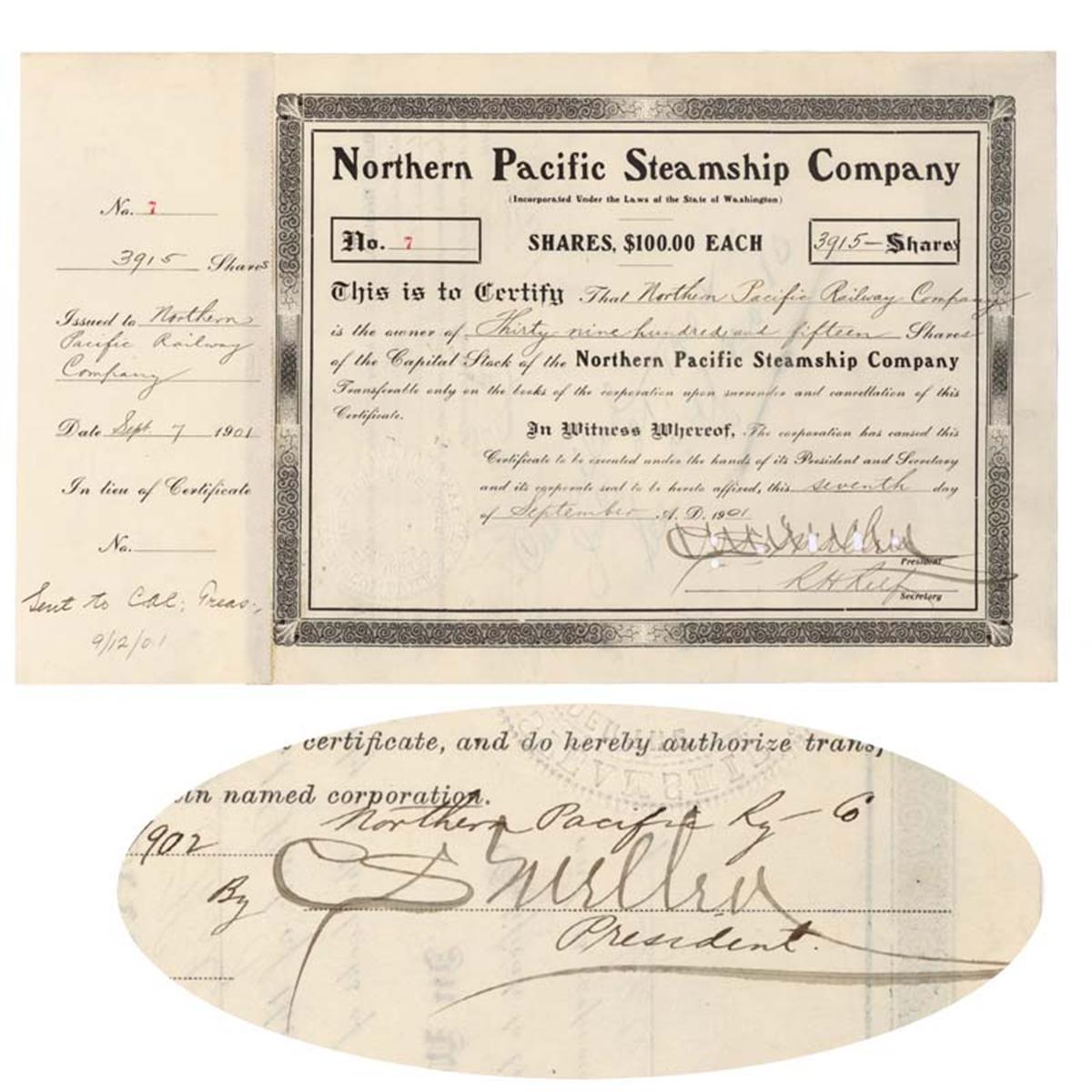 1901, Washington. Stock certificate for 3915 shares. Black. Issued to the Northern Pacific Railway Company and signed on verso by C.S. Mellen as NP president. Signed on front as President of the Northern Pacific Steamship Co. by Charles S. Mellen (1851 - 1927); Railroad executive; Financier. Mellen was the front man for many of J. Pierpont Morgan's railroad schemes, and was chosen by Morgan to be president of the Northern Pacific for him. Pen and punch cancellations through Mellen's signature on front, his signature on verso for the NP Railway is unaffected. An interesting piece with Mellen serving as Presidents for both concerns. Fine.