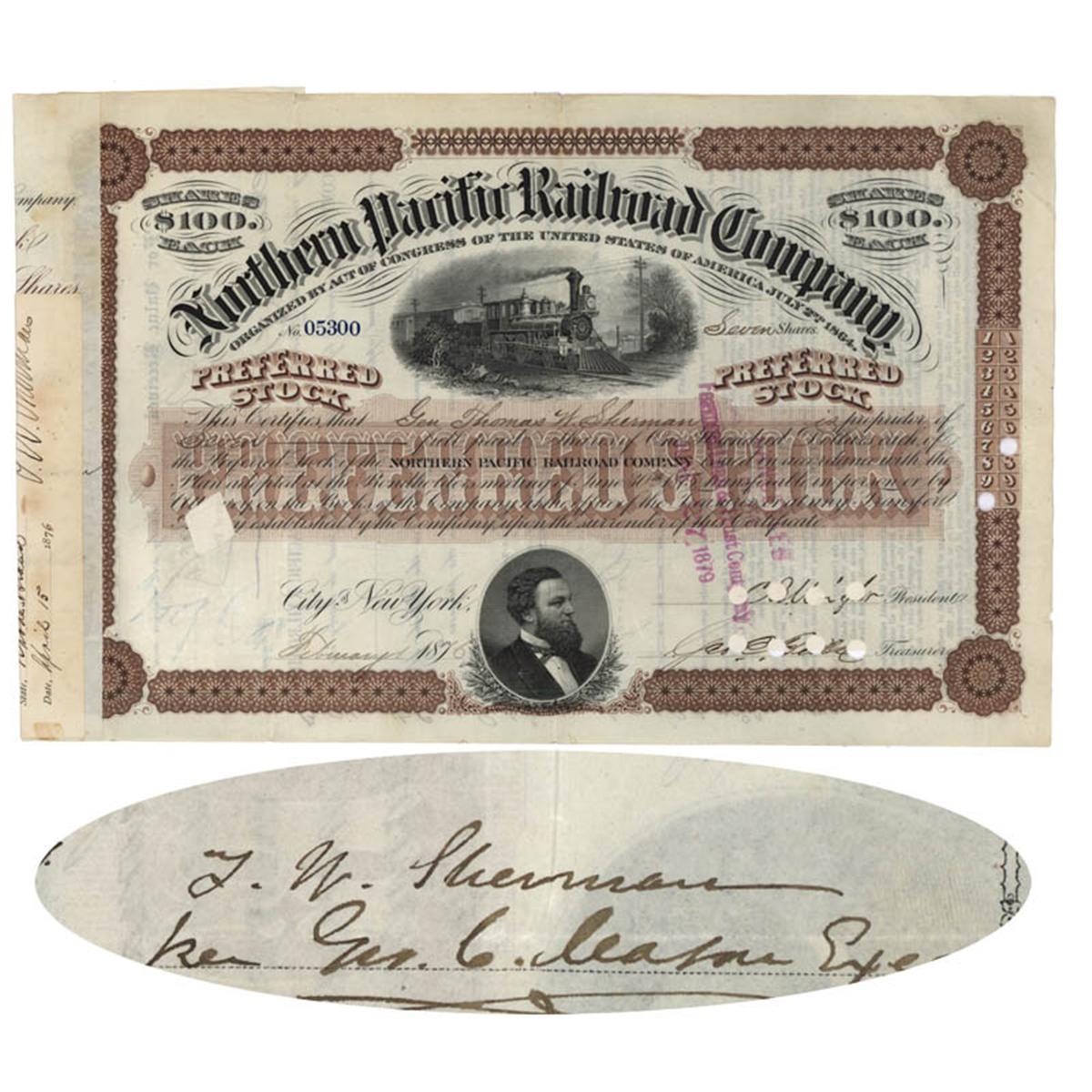 1876, Northern Pacific Railway Stock certificate for seven shares issued to and signed by Gen. Thomas W. Sherman. Attractive certificate with ornate border, vignette of a train passing by telegraph lines in the countryside and a lower vignette of Fredrick Billings. Signed on the accompanying stock scrip: "T.W. Sherman." GENERAL THOMAS W. SHERMAN: (1813-1879) Union brigadier general who helped capture Forts Beauregard and Walker in Port Royal Sound, S.C. 1861 and commanded Bank's left wing during the siege against Port Hudson in 1863. On May 27, 1863 while leading an attack upon the Confederate works he was wounded in the leg, losing the limb to amputation days later. At age 18 he walked almost 400 miles from home in order to speak with President Andrew Jackson about poor educational opportunities in Rhode Island. Jackson rewarded him for his effort by giving him an appointment to the US Military Academy at West Point. Graduating from West Point in 1836, he fought in campaigns against Indians, and in the Mexican War.Punch hole cancellations, light browning just under Sherman's signature, which is bold and nicely executed. Very Fine.