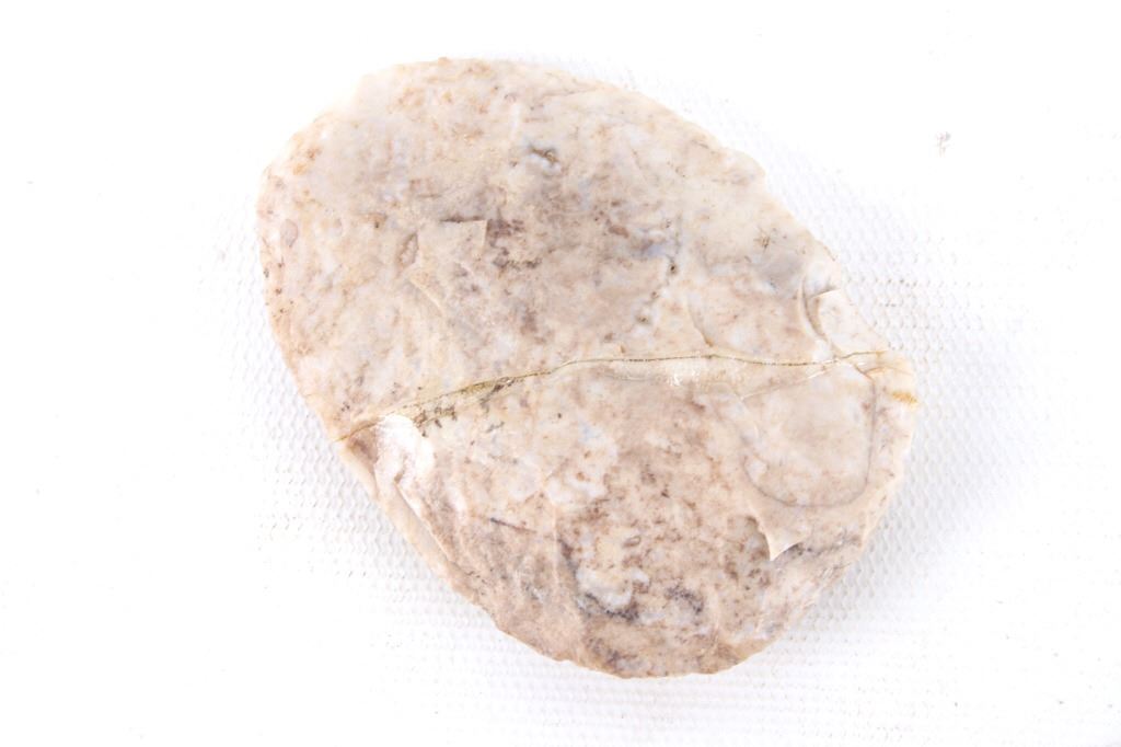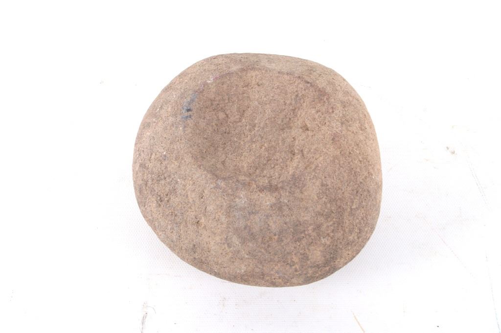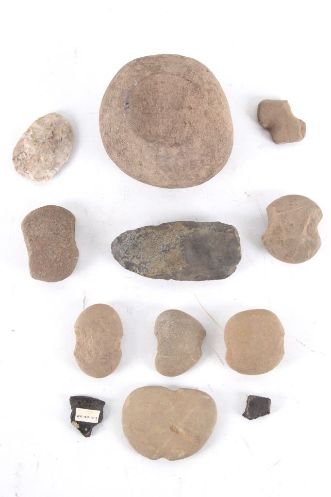 For your bidding pleasure in this lot is a collection of Northern Plaines Indians stone tools from 8000-2200 BP. The collection is made of seven stone heads, Celts, and Adzes. The heads range in size from 4" x 3” to 2 1/4" x 1 3/4". Next is a Turtle-Back scrape 5 1/2" x 2 3/4" and a grinding stone 5 12/" x 5 1/2" x 3". Last is a scraper with a collection tag. This teardrop scraper measures 3" x 2 1/2" x 1/2". This scraper was broken and repaired and has a museum/collector tag on the back. Last are two pieces of pottery, one with a tag. Please see photographs for assessment of items.
