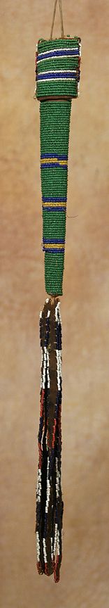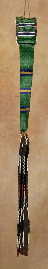 Northern Plains Awl Case. 18" long with fringe drops. Finely beaded in two tone blues, greasy yellow, white-heart red & white on a vibrant green background. Drops are edged in single lane beadwork. 19th century. (est. $600-900). CONDITION REPORTS: www.auctioninsantafe.com/docs/cr2012.pdf