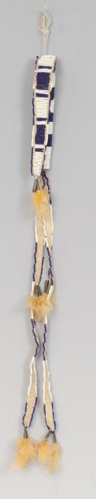 Northern Plains Awl Case and Awl. 19" long with drops. Showy drops with tin cones and feathers. Condition Report: Excellent condition.