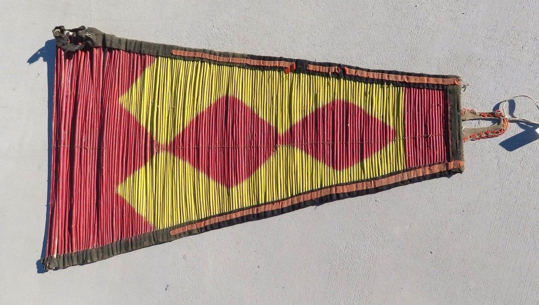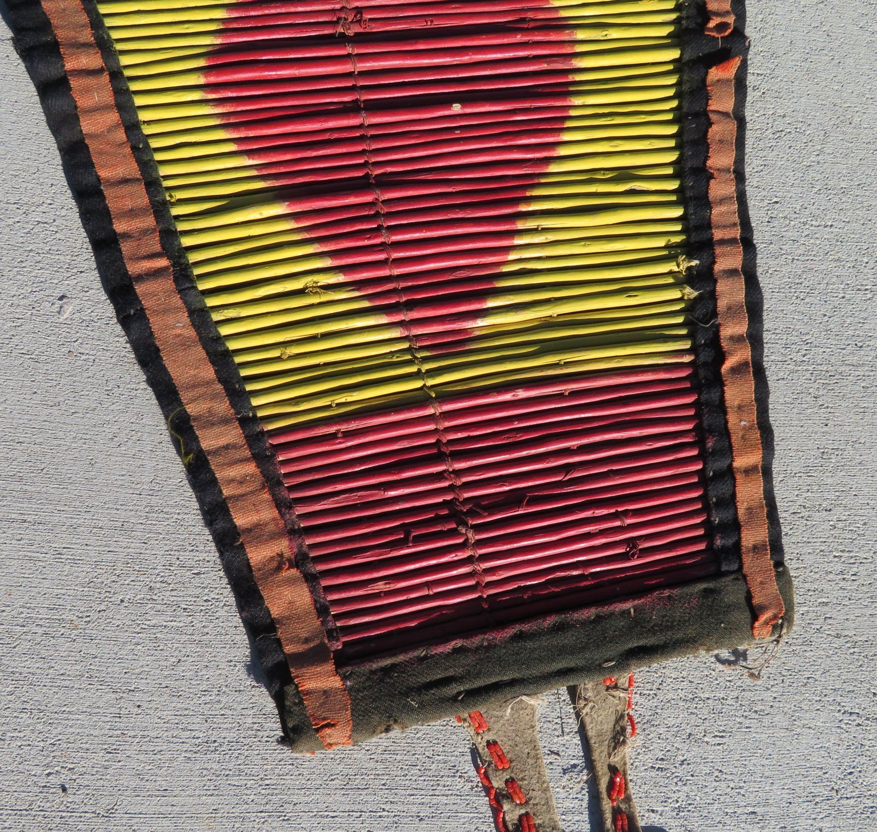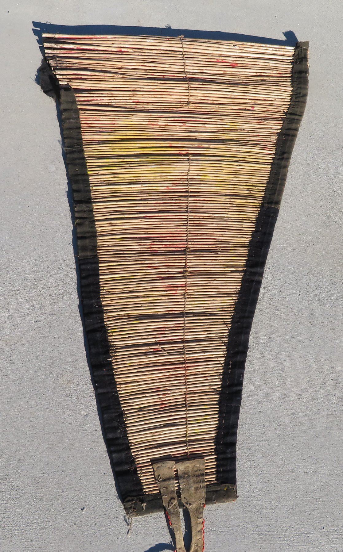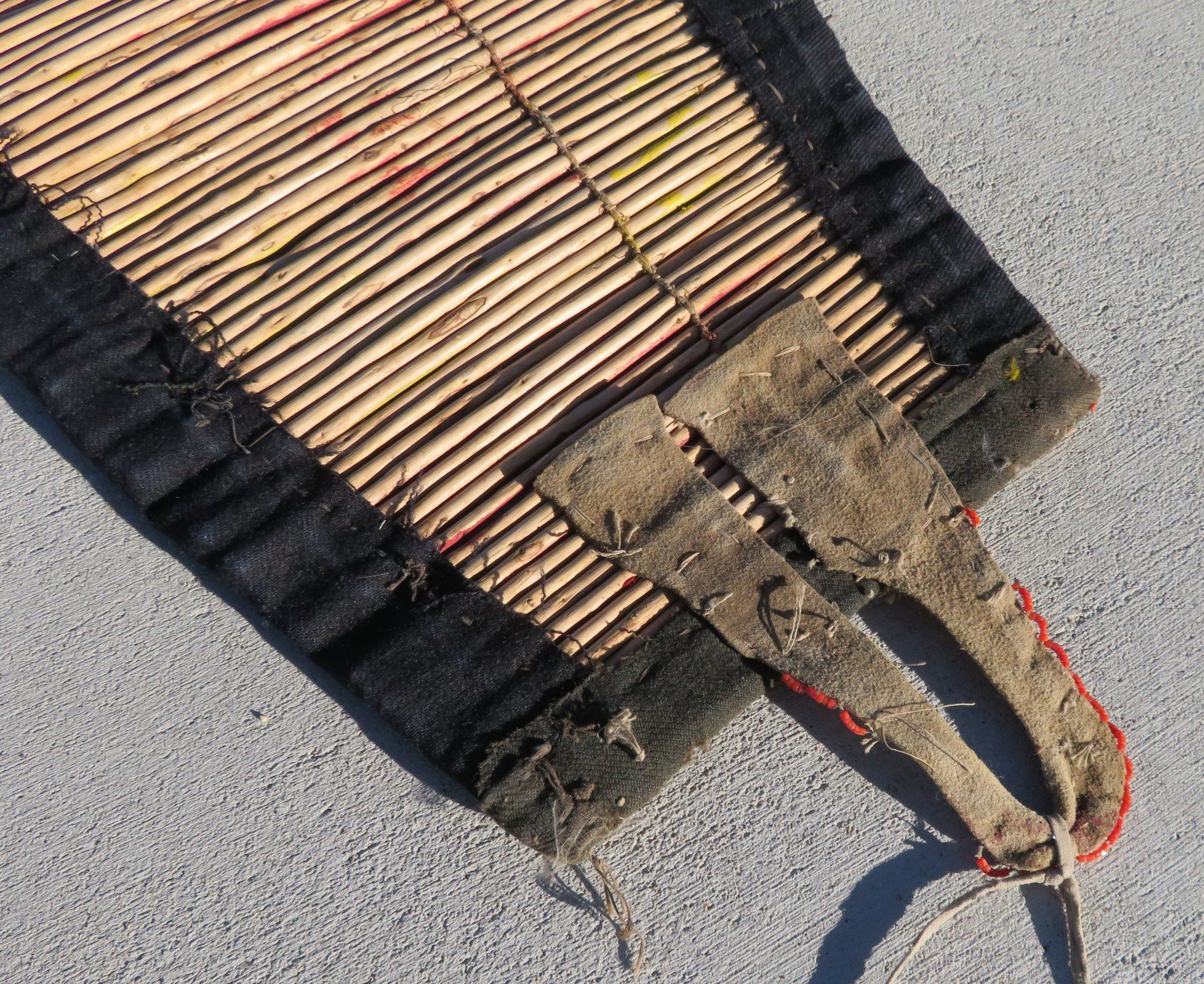 Northern Plains Back Rest, c. 1900. Made of willow, string, sinew and cloth, the item is 55" long x 29" wide at base. Northern Plains. Nice paint, rare item. Condition: Cloth tearing on one side, see images. Shipping: $37.50 w/insurance and signature, due to size and value.
