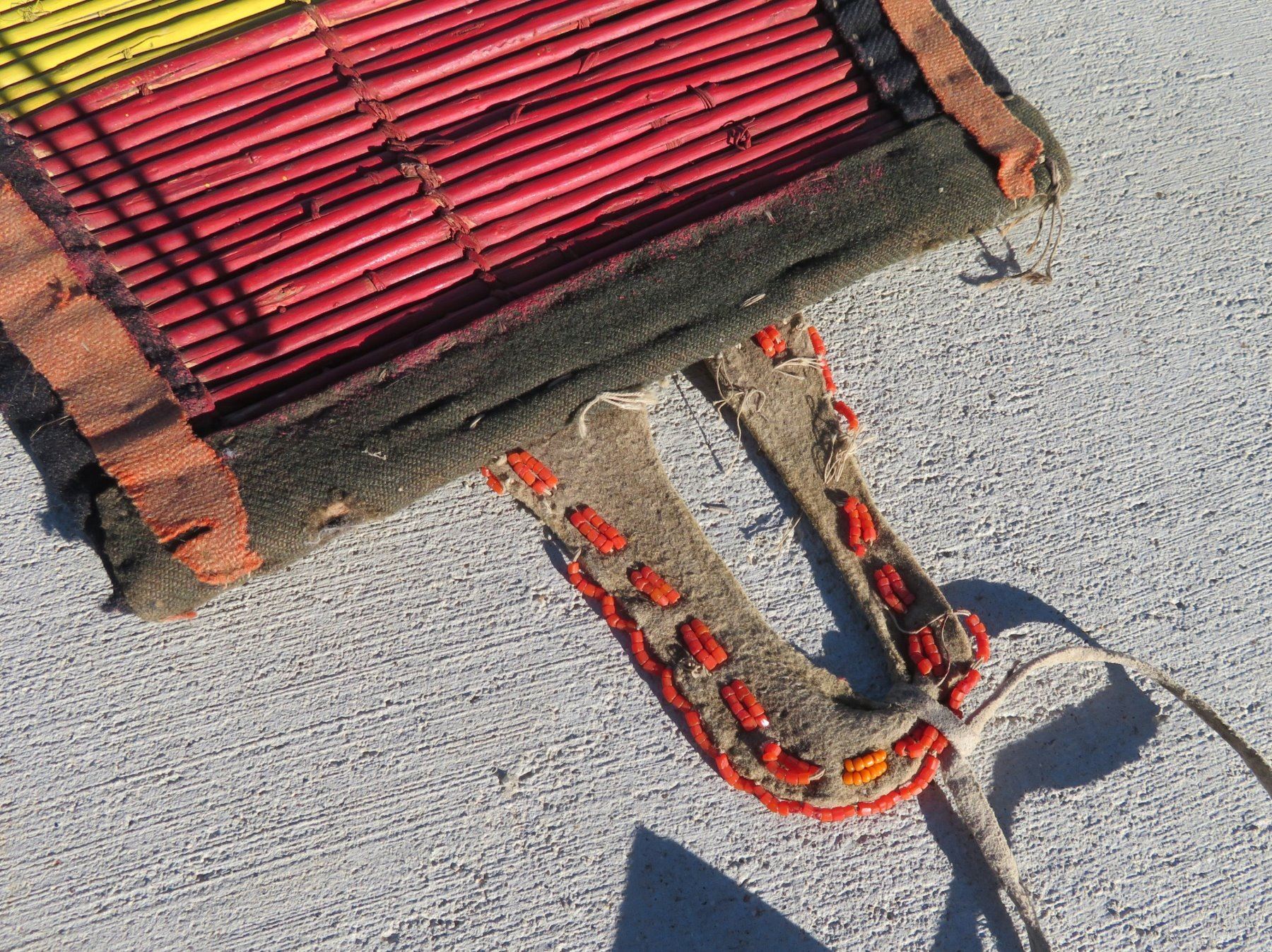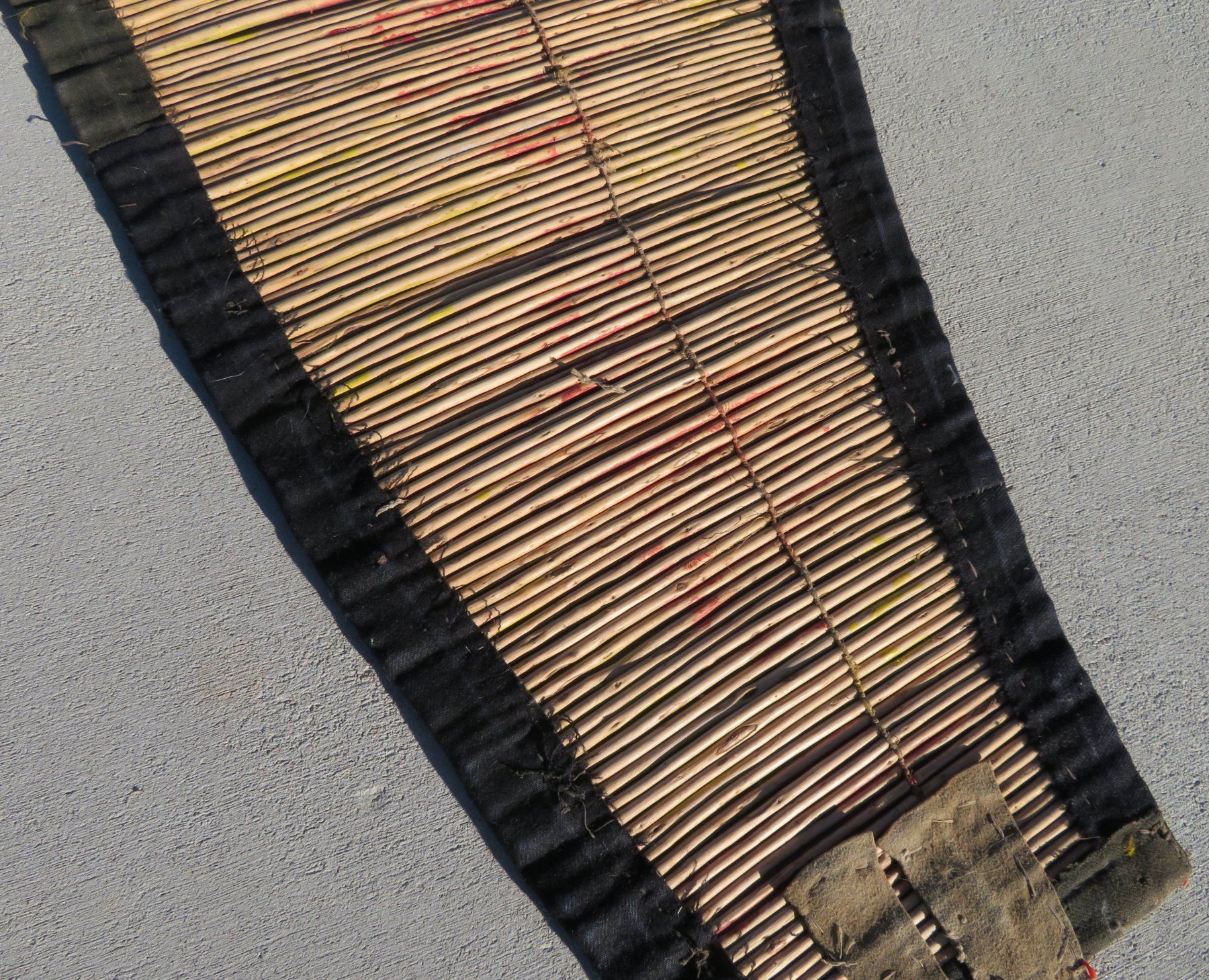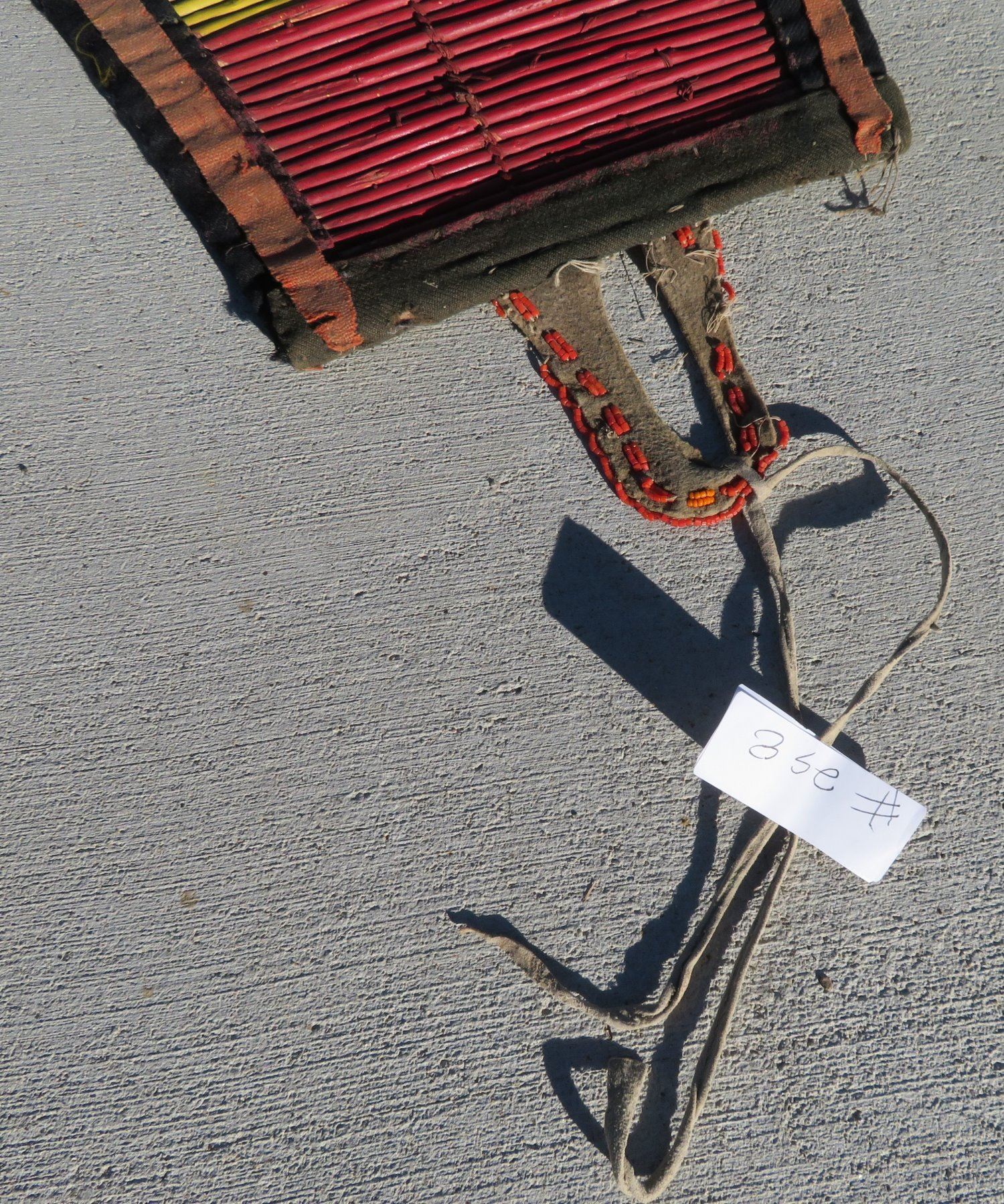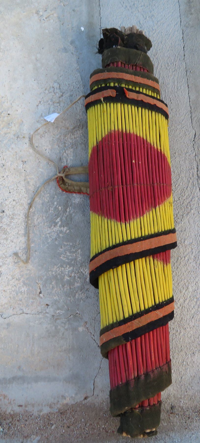 Northern Plains Back Rest, c. 1900. Made of willow, string, sinew and cloth, the item is 55" long x 29" wide at base. Northern Plains. Nice paint, rare item. Condition: Cloth tearing on one side, see images. Shipping: $37.50 w/insurance and signature, due to size and value.