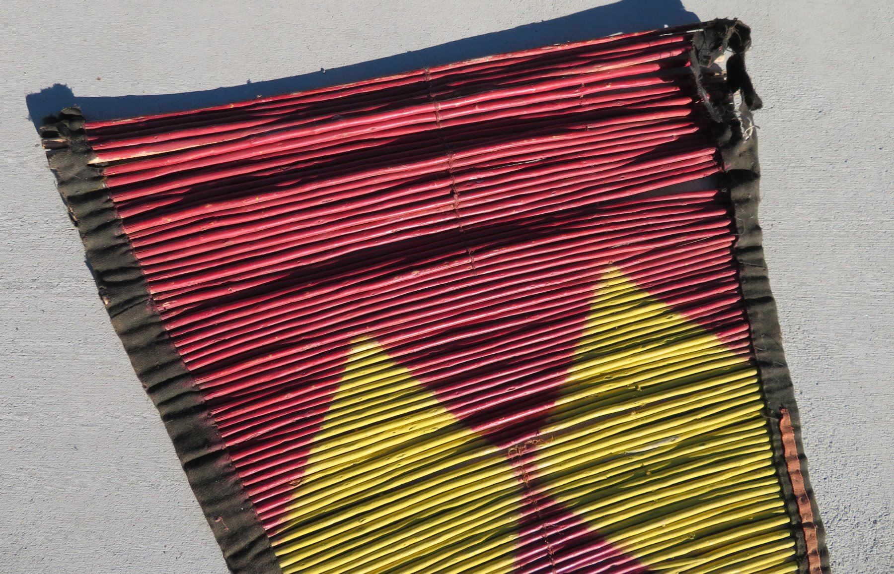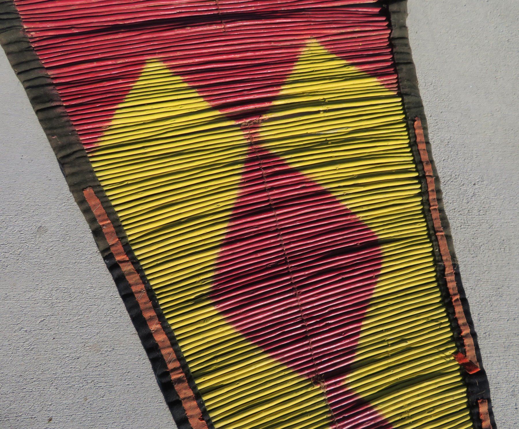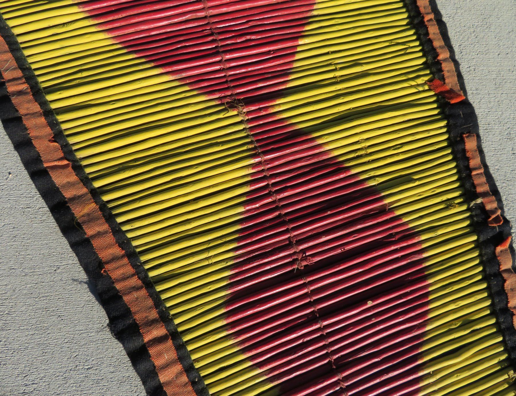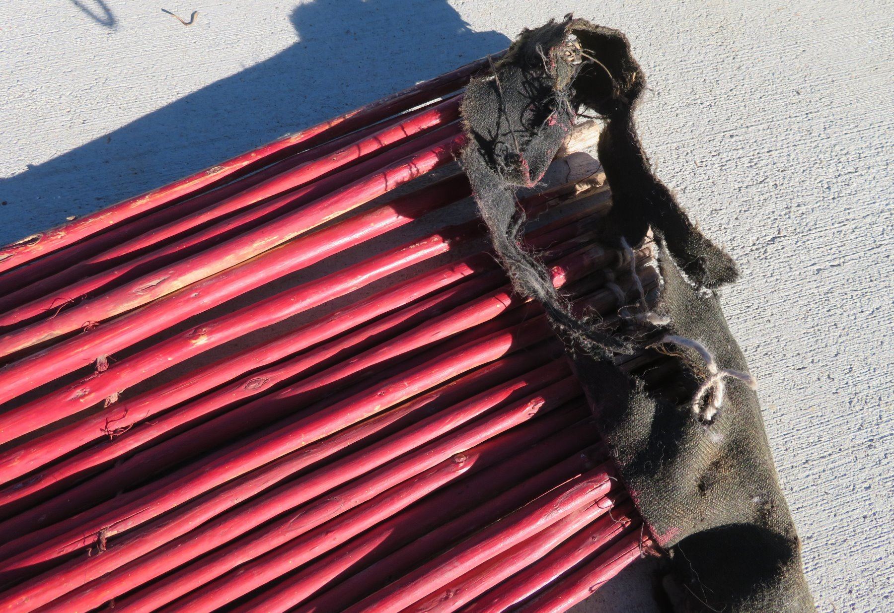 Northern Plains Back Rest, c. 1900. Made of willow, string, sinew and cloth, the item is 55" long x 29" wide at base. Northern Plains. Nice paint, rare item. Condition: Cloth tearing on one side, see images. Shipping: $37.50 w/insurance and signature, due to size and value.