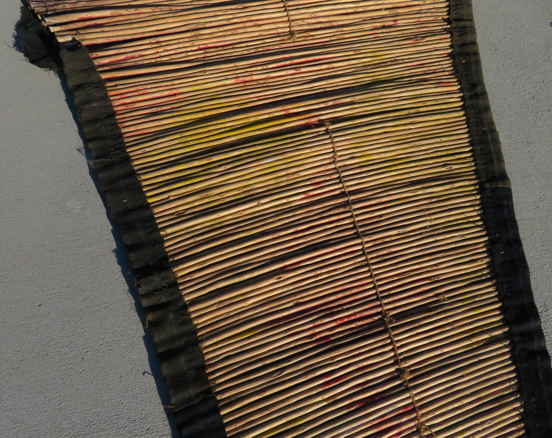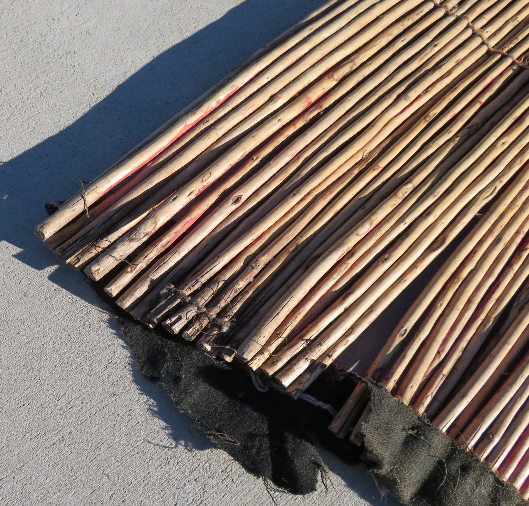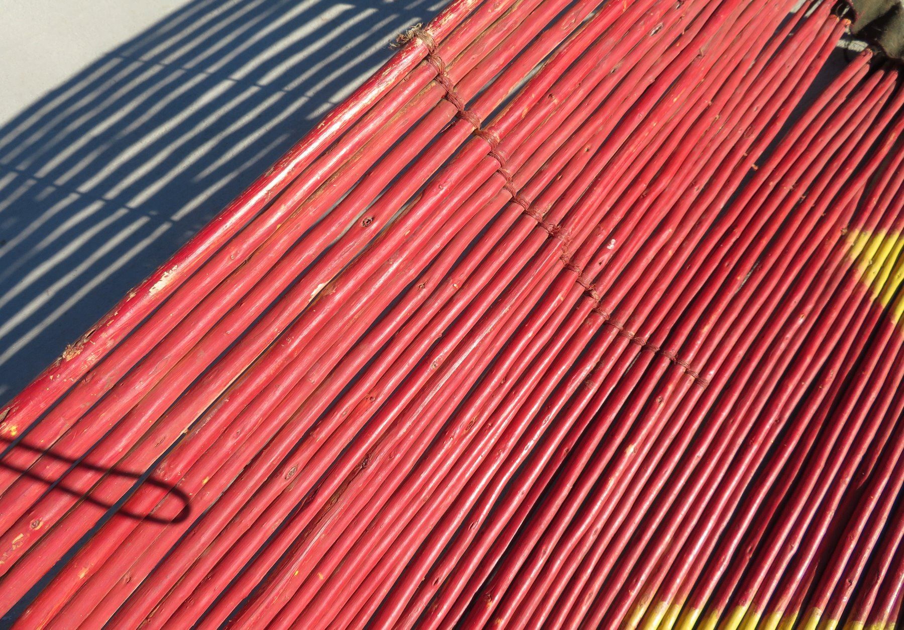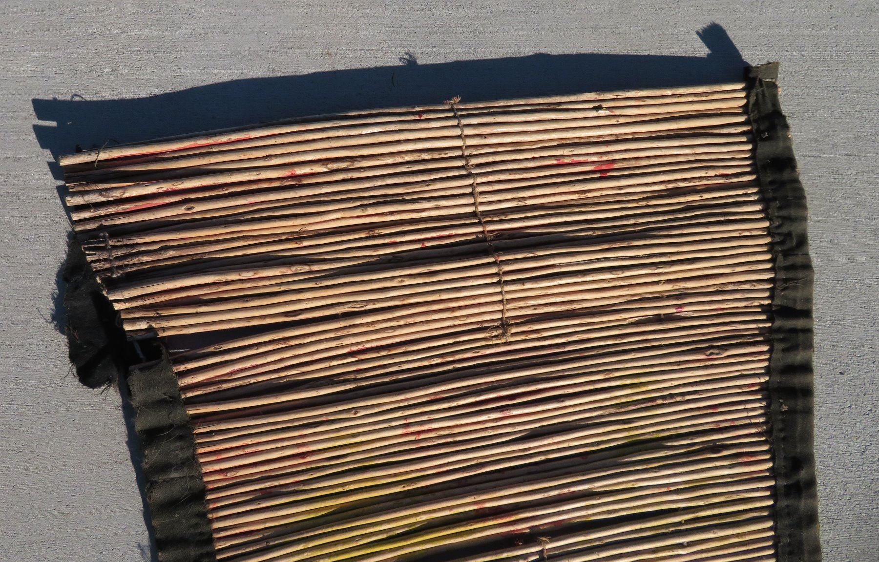 Northern Plains Back Rest, c. 1900. Made of willow, string, sinew and cloth, the item is 55" long x 29" wide at base. Northern Plains. Nice paint, rare item. Condition: Cloth tearing on one side, see images. Shipping: $37.50 w/insurance and signature, due to size and value.