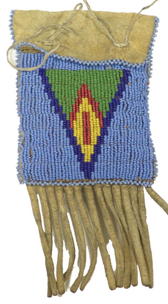 Early & Mid 1900s, Very fine fringed bag with lazy stitch sinew beading in the body. 4-1/4" x 3-1/2" plus 2-1/2" fringe