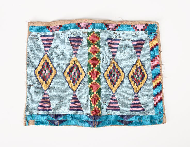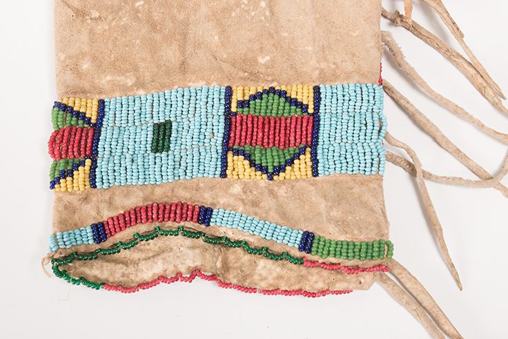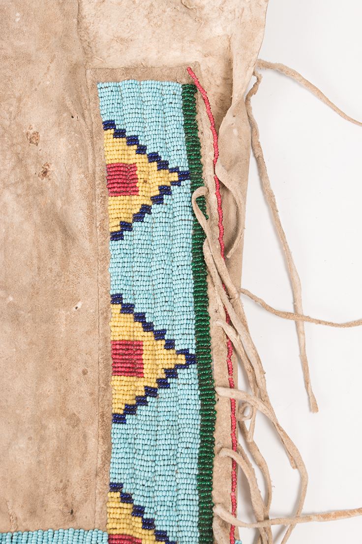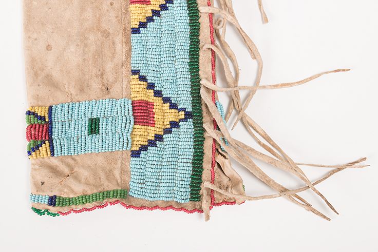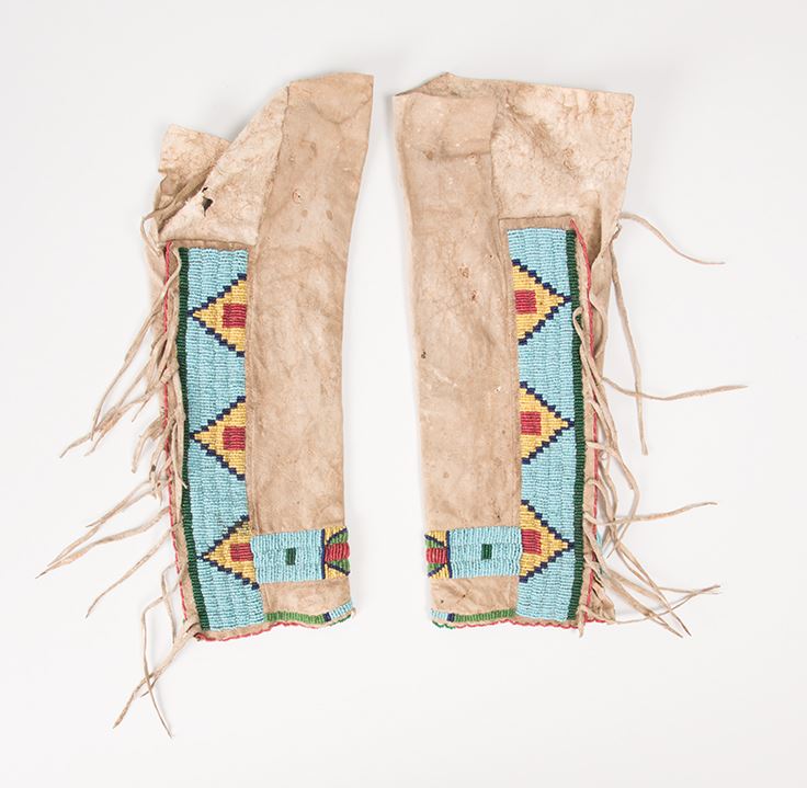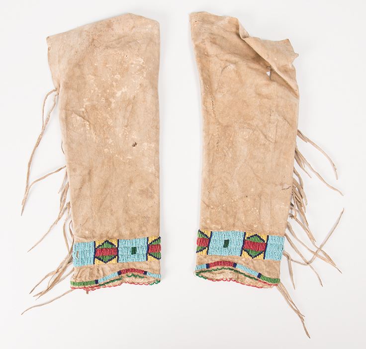 Northern Plains Beaded Child's Leggings together with a Single Woman's Legging. Child's leggings are 13 ½" x 5". Late 19th century. Woman's legging is 12" x 9 ½" with extraordinary designs. Late 19th century.