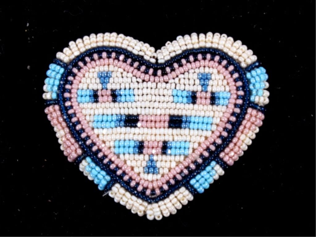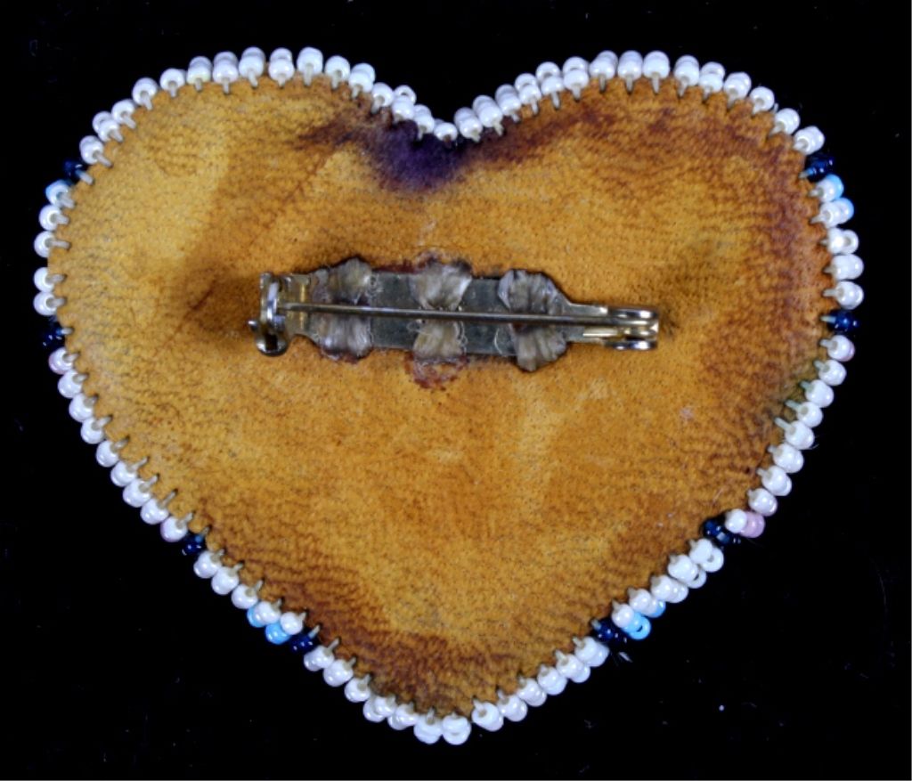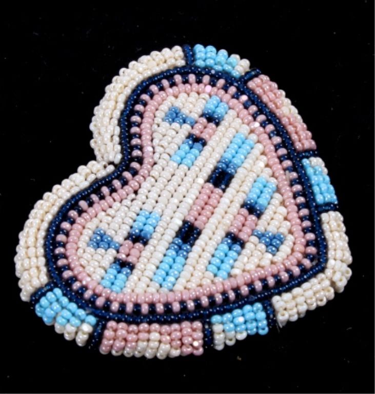 This is a mid-century handmade piece by Northern Plains Native American. The pin features a tightly woven glass trade bead front, sown with sinew and trade cotton thread. Done on Indian tanned buck skin. Thislot is in good condition. Measures 1.75"x2".