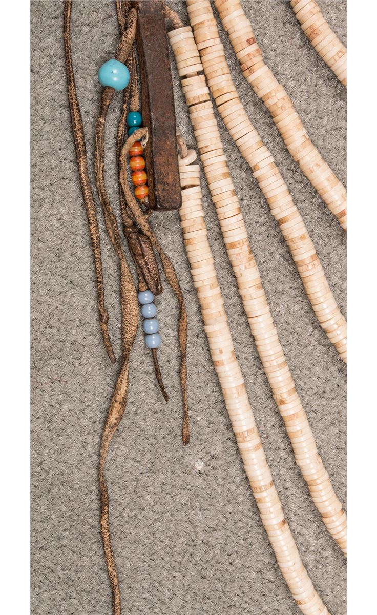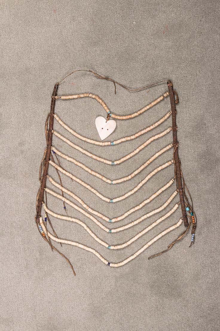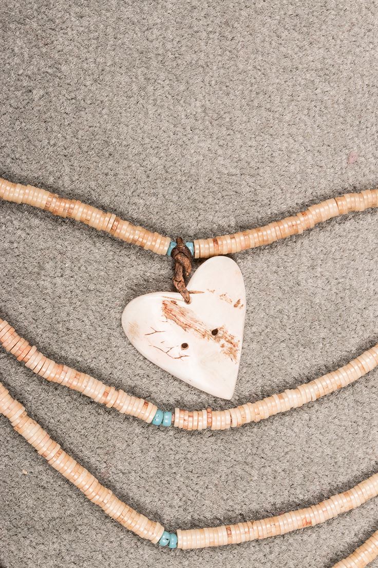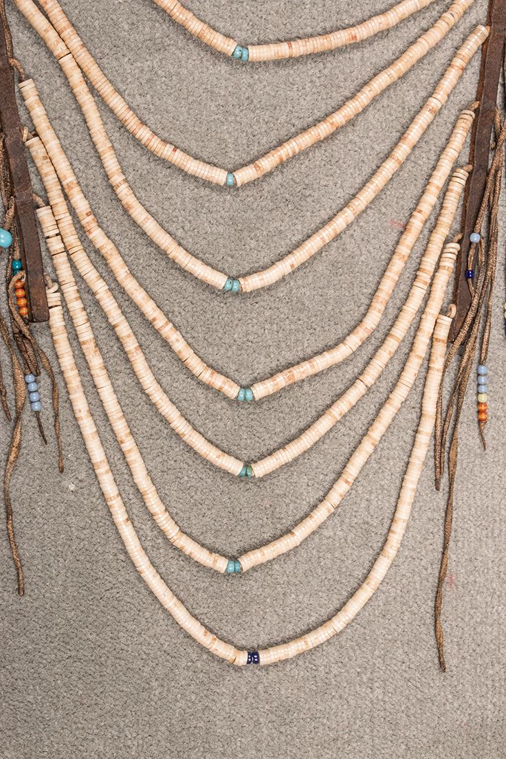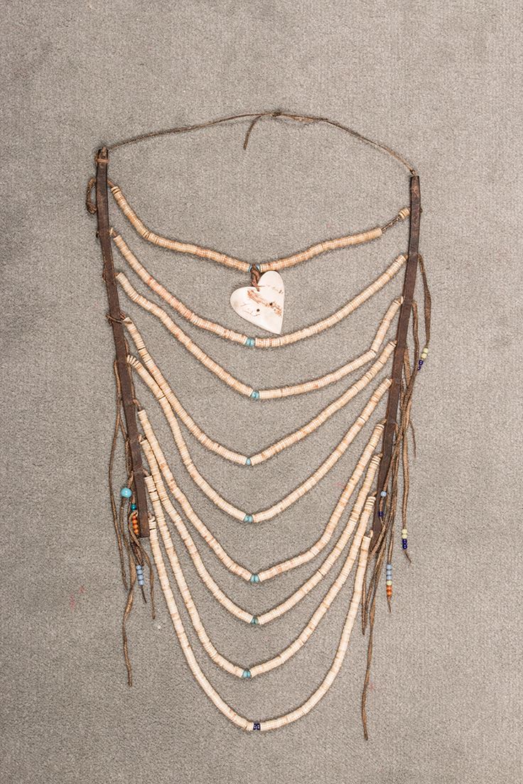 Northern Plains Beaded Heishi Loop Necklace. 25" x 11". Nine strands constructed of shell and trade beads strung on harness leather. Has heart shaped bone accent on upper center of necklace and is accented with turquoise beads. 19th century. These are difficult to find in all original condition.