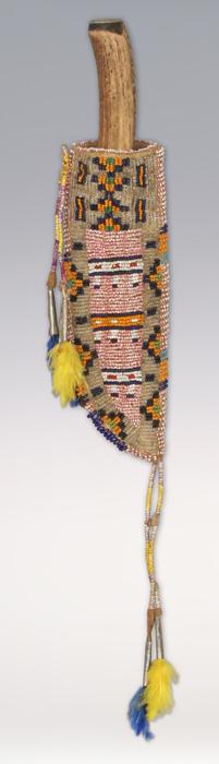Northern Plains Beaded Knife Case. 8 1/4" long. Quilled drops with tin cone and feather decorations. C. 1910. Includes knife with bone handle. 11" long. Condition Report: Case is in excellent condition. Knife shows use and has good patina.