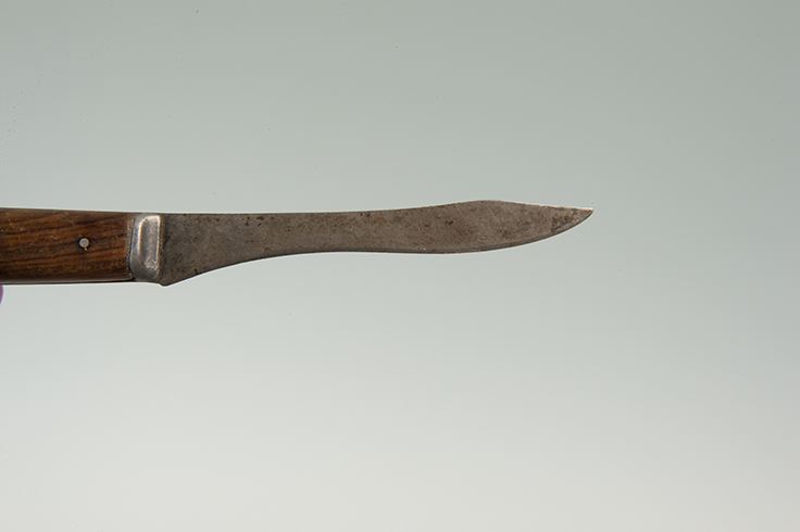Northern Plains Beaded Knife Case and Knife. 9" long with a 5" beaded drop. Classic 19th century bead colors on the front with a parfleche back. An unmarked 10" skinning knife included.