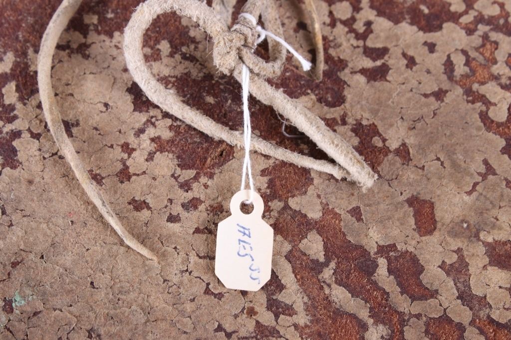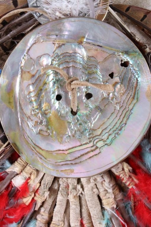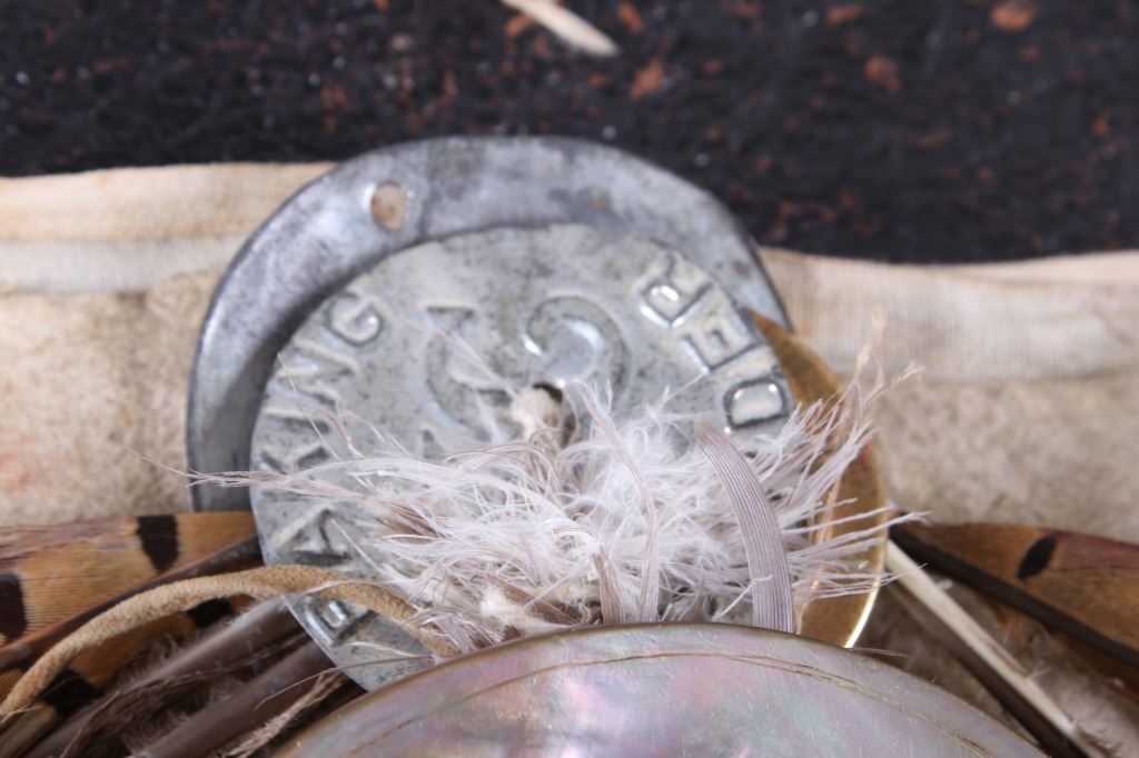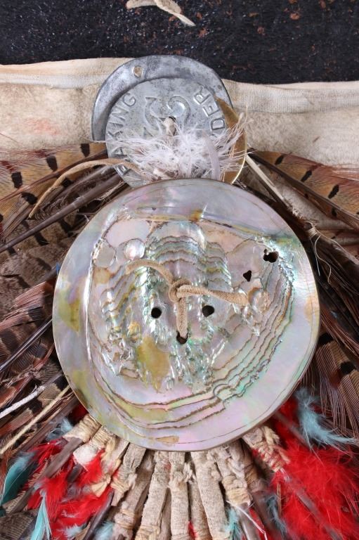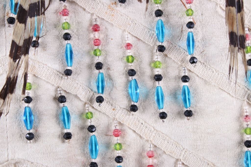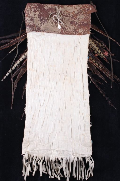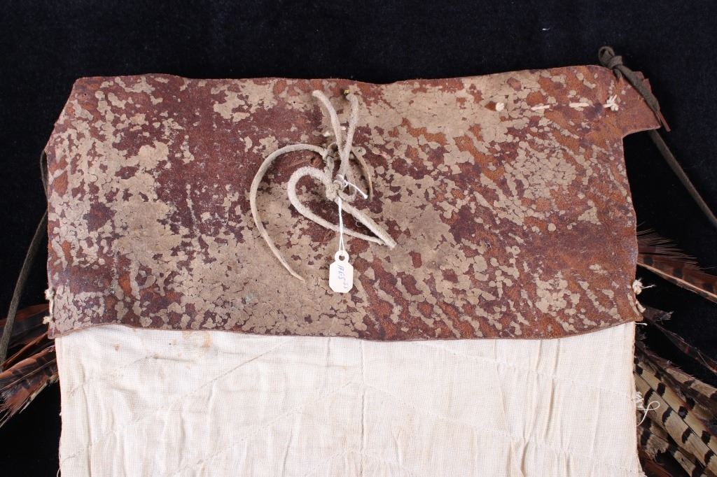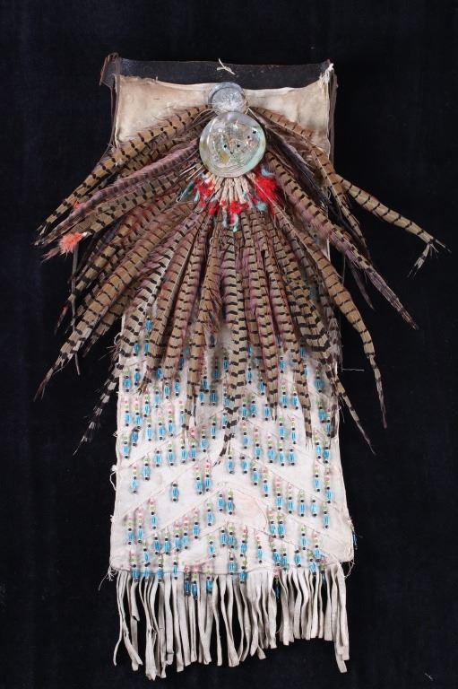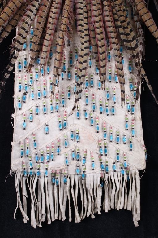 The lot features a beaded and pheasant feather adorned breech clout from the Northern Plains Native American Indians dating to circa 1900. The piece shows a U.S. Tent or tipi trade canvas and Indian tanned hide construction with excellent early 1900 trade beads and has a plume of pheasant feathers being secured with a large abalone shell gorget. The feather plume also shows an early KC Baking Powder tin top, gilt tin pocket frame and a tobacco snuff tin advertising top tied on with Indian tanned hide beneath the large gorget. A large gorget banner of abalone of this size is truly a fantastic and rare addition. The belt shows an early saddle harness leather construction with trade clothe ties. The beadwork is displayed in an inverted “v” pattern and shows fantastic faceted Czechoslovakian glass in black, green red and blue. The pheasant feathers are all covered in Indian tanned hide and is adorned in red and blue feathers. The piece was originally adorned with plumes of American Bald Eagle feathers, a true attribute to the authenticity and age of the piece (the Eagle feathers have been removed and destroyed to abide by all laws). The piece would have been worn as a breech clout front skirt panel on a warrior as a ceremonial dance outfit. Provenance: From a large American Indian collection in Great Falls, Montana. The piece has an original museum collection tag that reads, “AES SS” and “B-15.67”. The piece is in well preserved condition. Measures overall 35.5”l X 28”w at the widest feather points.
