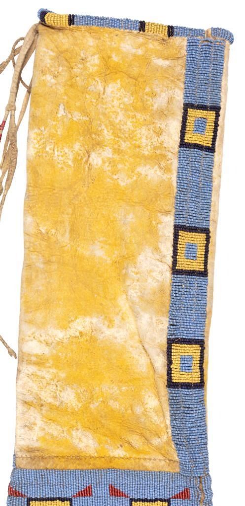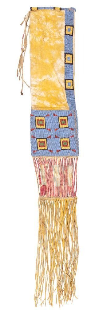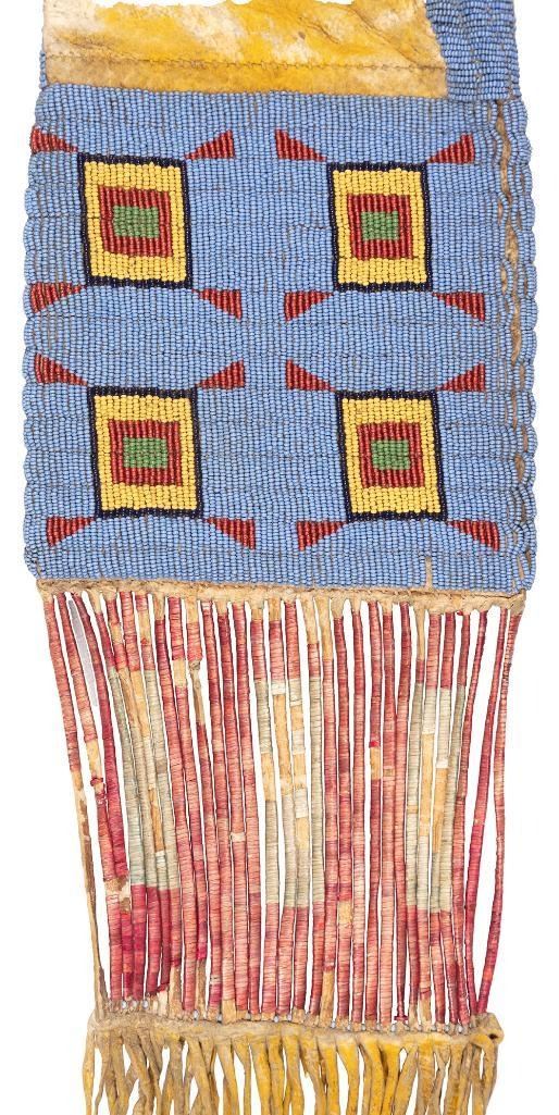 36" long overall x 6" wide. Geometrically beaded with different designs on both sides in colors of blue, yellow, green and white heart reds, beaded on yellow ochred hide with yellow ochred fringe. 19th century. Custom display hanger.