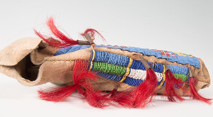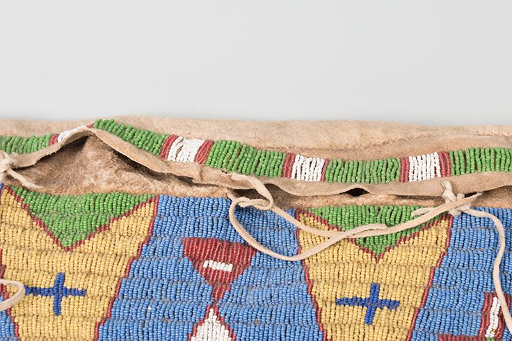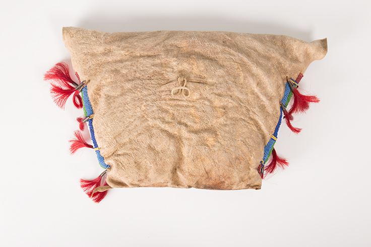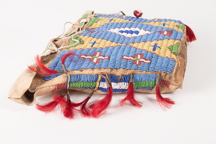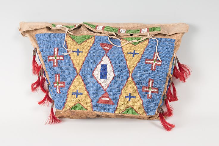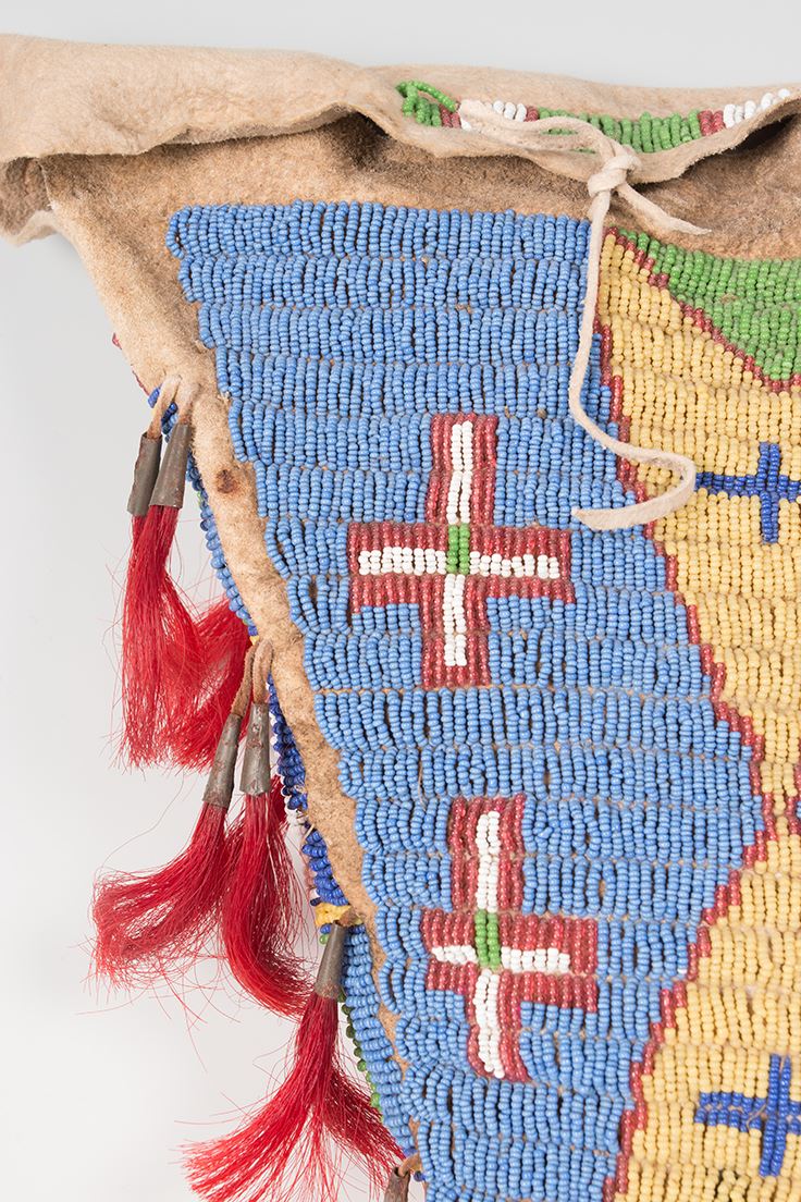 Northern Plains Beaded Possible Bag. 17" wide at top x 9" tall. Great geometric designs in all traditional colors. Accented with tin cones stuffed with horsehair. Beaded on buffalo hide. Circa 1870's.