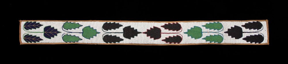 4 1/2” x 45” green, black and blue leaf design on white background, with woven cloth backing. Circa 1900.