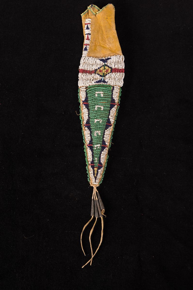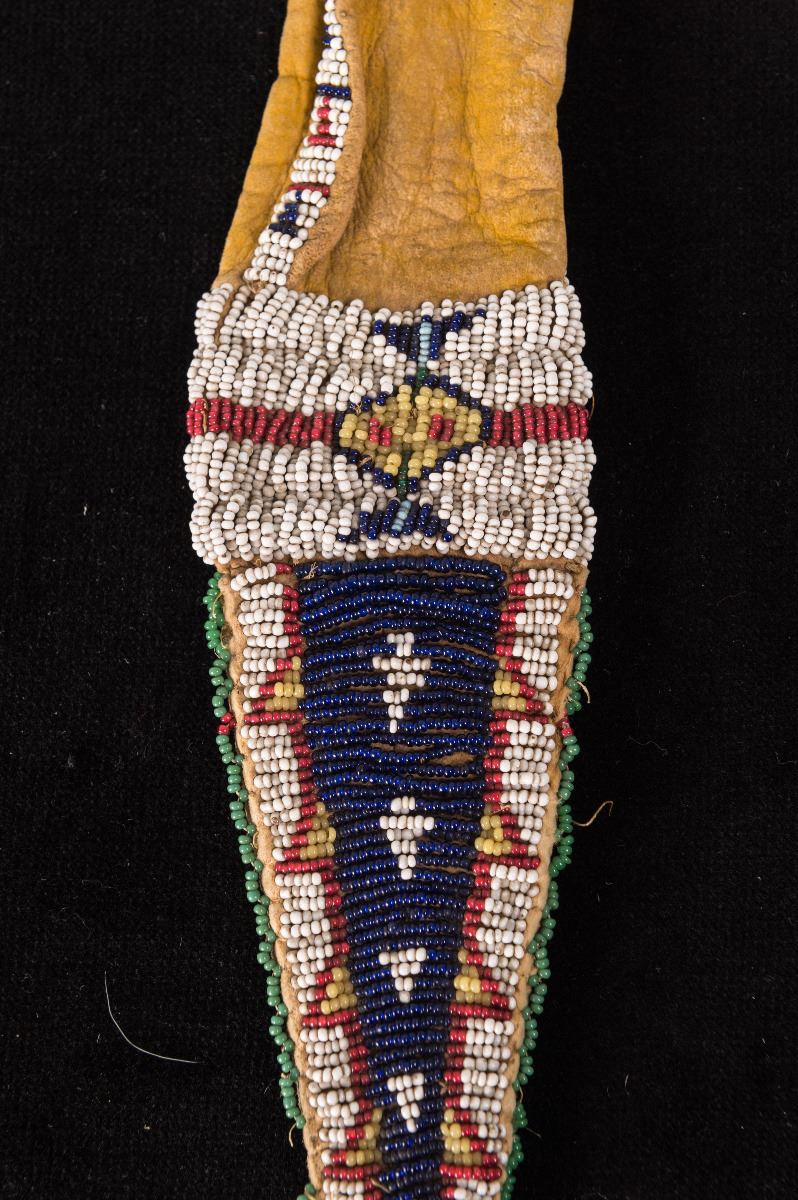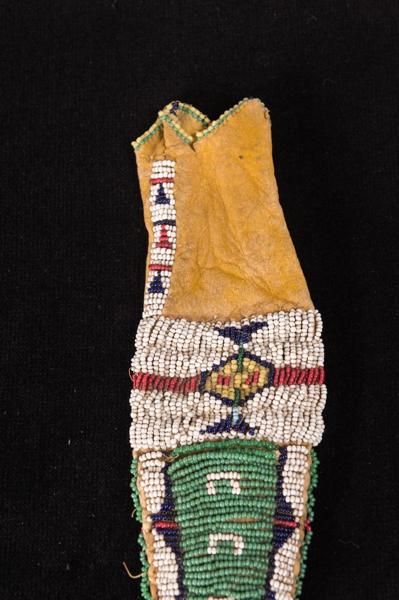 Northern Plains Beaded Tail Bag. 9" x 2". Finely beaded on both sides with horse track and arrowhead designs on yellow-dyed leather. 19th century.