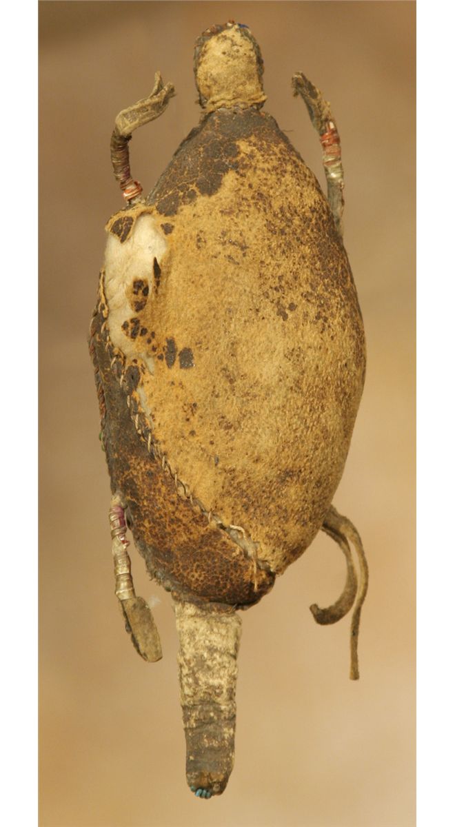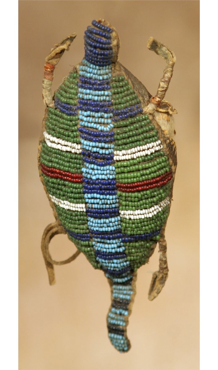 Northern Plains Turtle Fetish. 6" x 2.25". Hide fetish in the form of a turtle. Beaded on the top in colors of green, pale blue, dark blue, white and white-heart red. Three of the legs are wrapped in quills. 19th century. Provenance and literature: Collection of Dr. Delwin and Karen Bokelman, PA., and pictured in their book Precious Dreams, page 6.