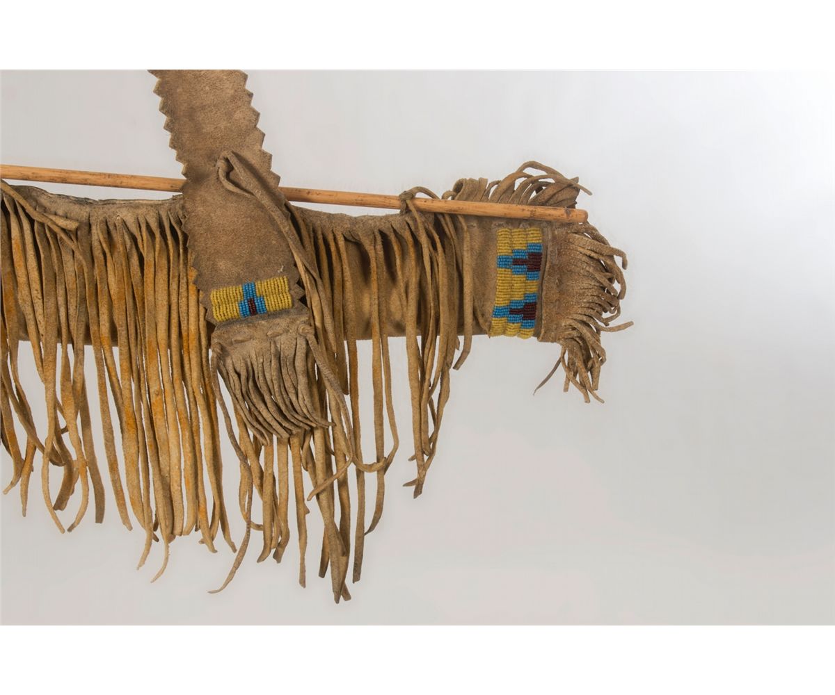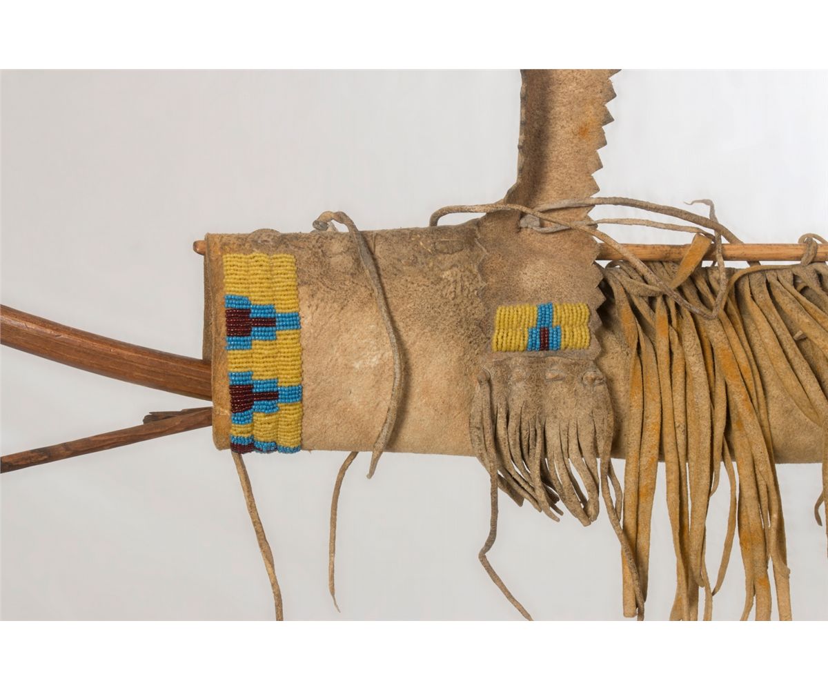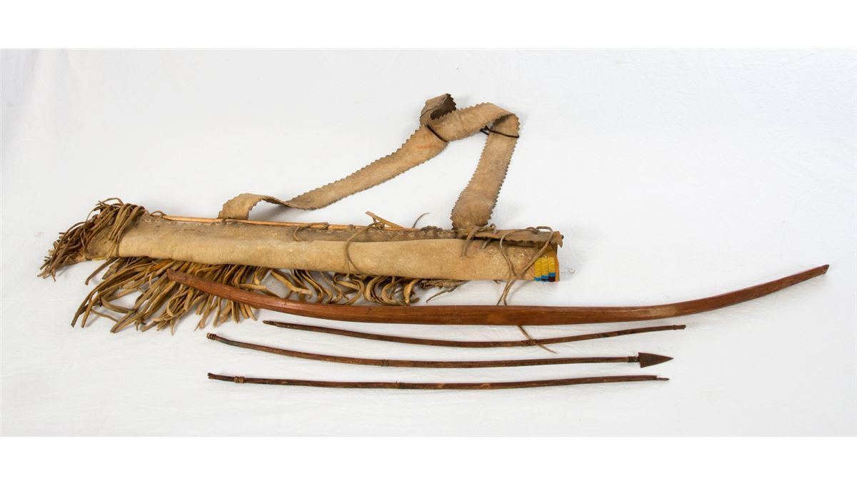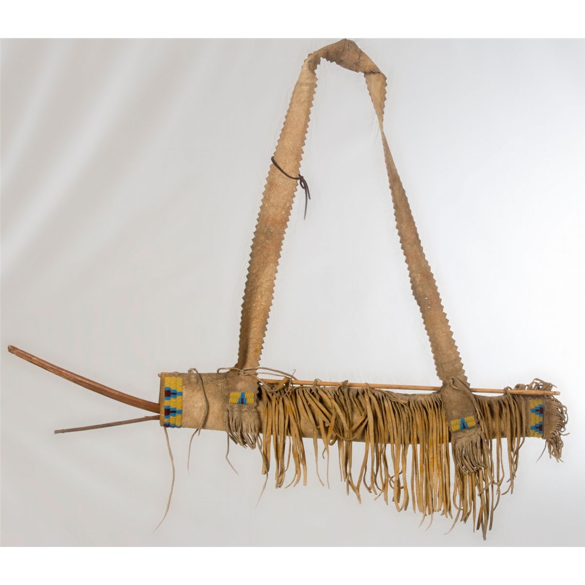 Northern Plains Bow and Arrow Case. 31 " long. Buffalo hide beaded on either end. Attached scalloped carrying strap with beaded ends. The entire piece is heavily fringed. Includes 39" bow and three 24" metal tipped arrows. Circa 1890-1920. Provenance: Estate of Jim Nicholls.