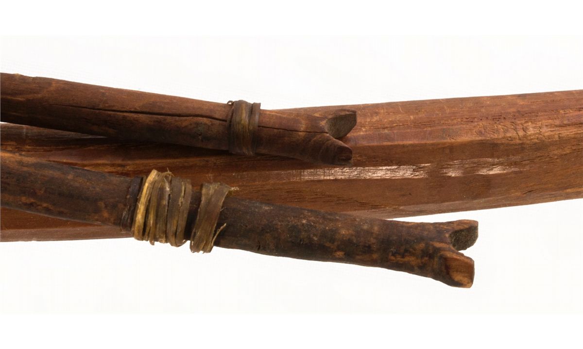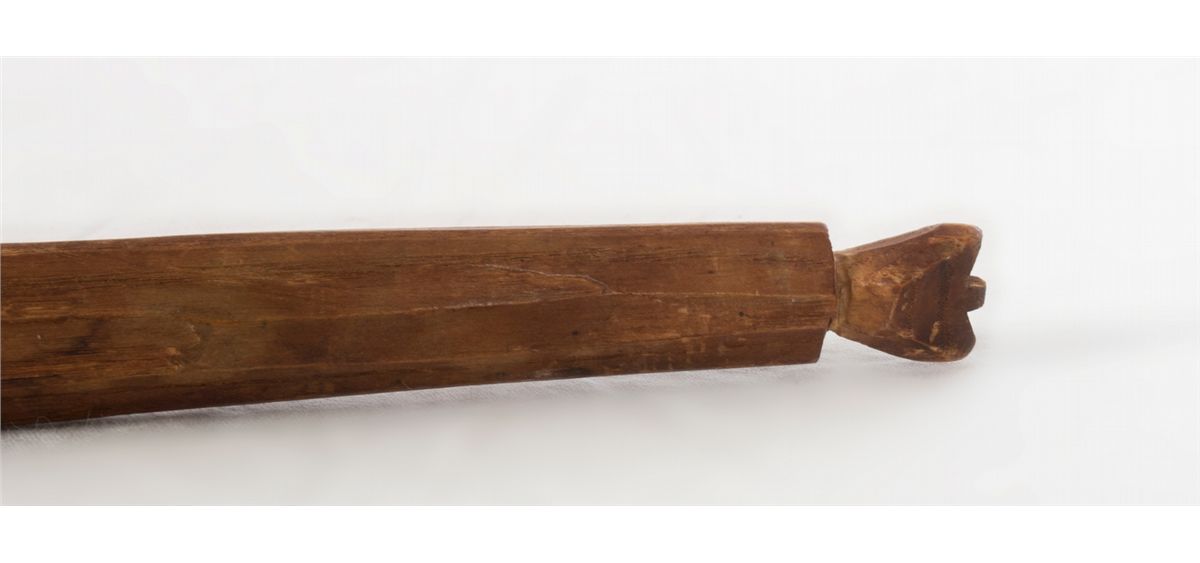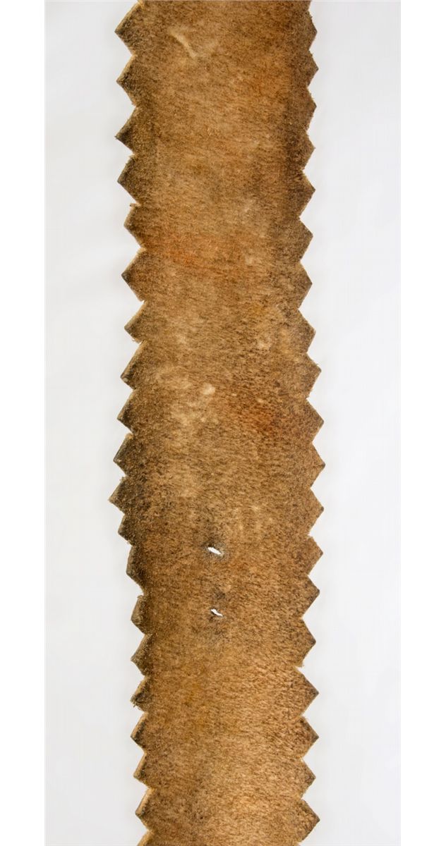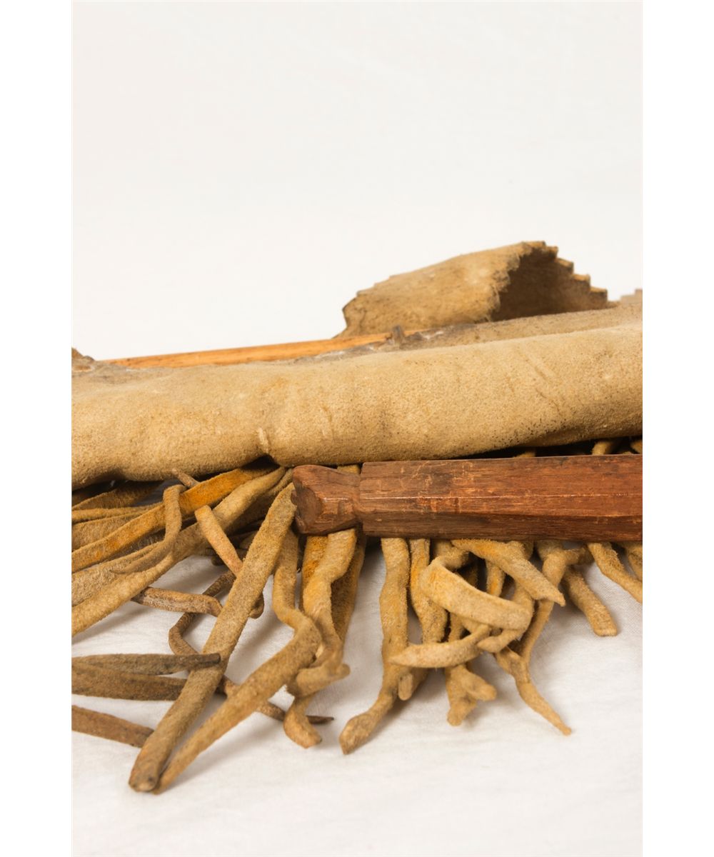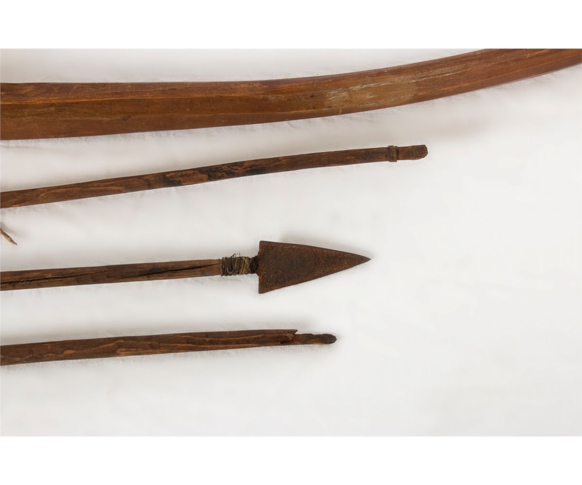 Northern Plains Bow and Arrow Case. 31 " long. Buffalo hide beaded on either end. Attached scalloped carrying strap with beaded ends. The entire piece is heavily fringed. Includes 39" bow and three 24" metal tipped arrows. Circa 1890-1920. Provenance: Estate of Jim Nicholls.
