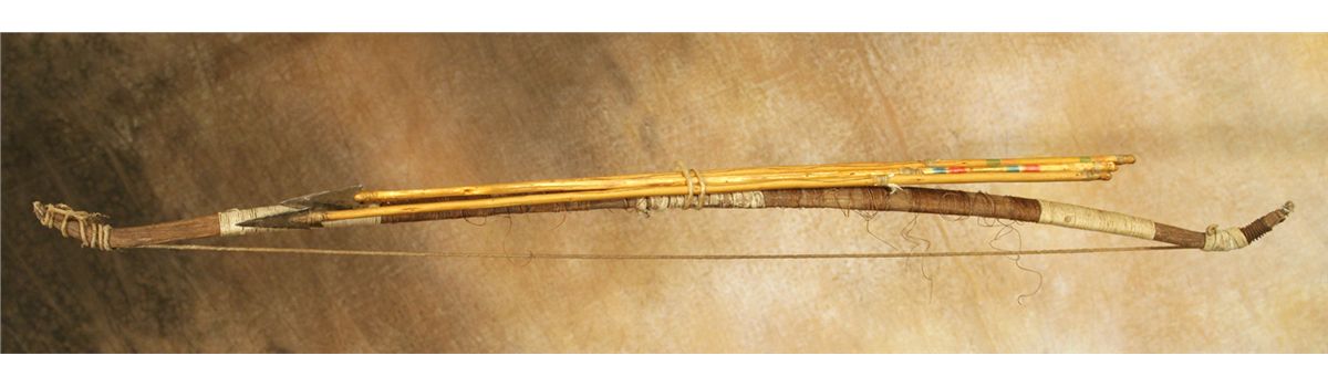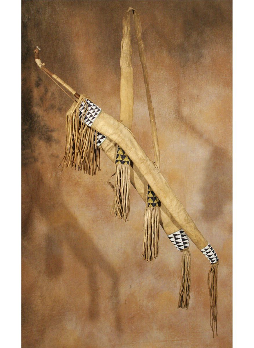 Northern Plains Bow and Quiver Case. Bow case is 33" long with beadwork and fringe on both ends, adorned with a beaded drop. Quiver is 25" long with beadwork and fringe on both ends. Together with 33" sinew-backed bow and 3 iron-tipped arrows. 19th century. Provenance: Ex-Wintersteen collection.