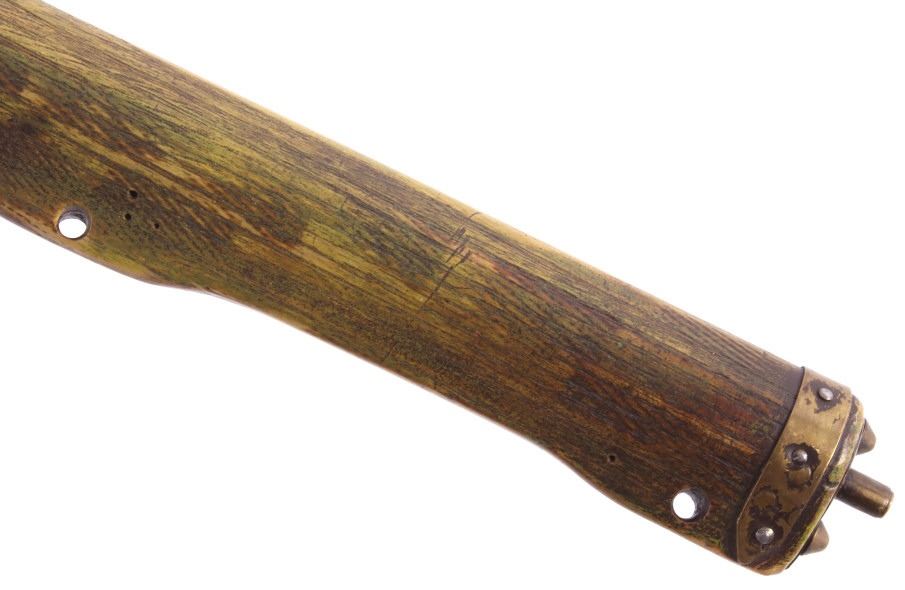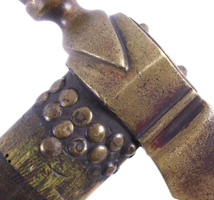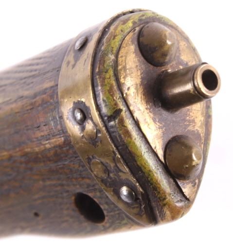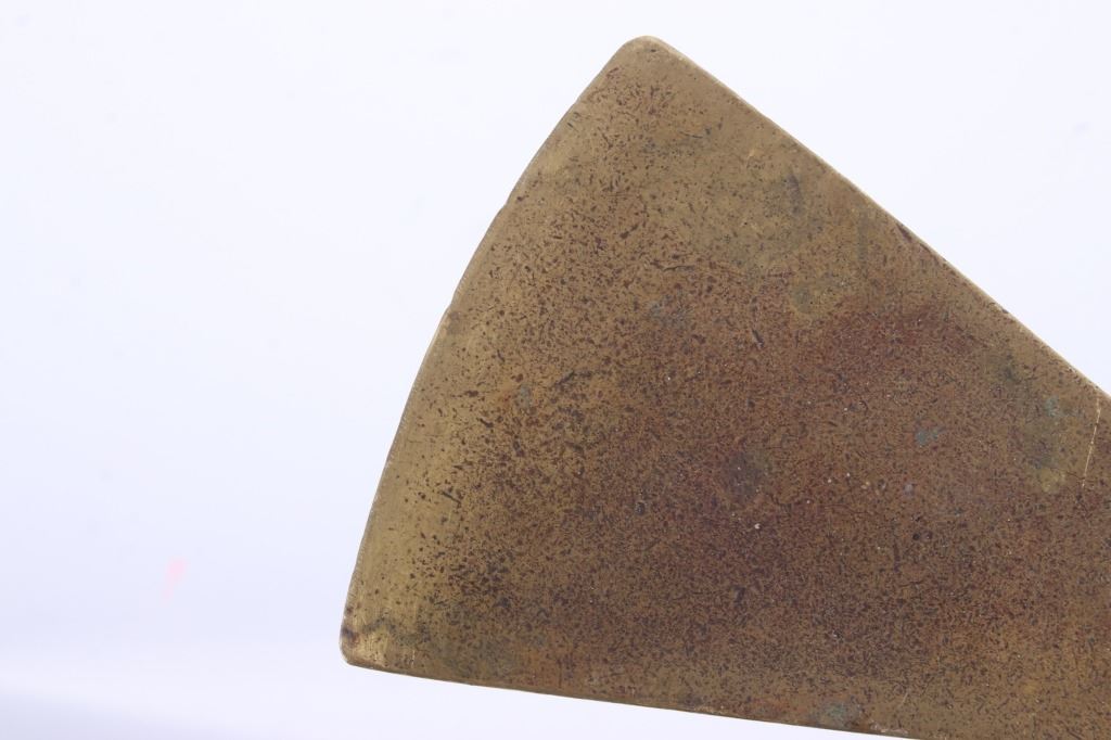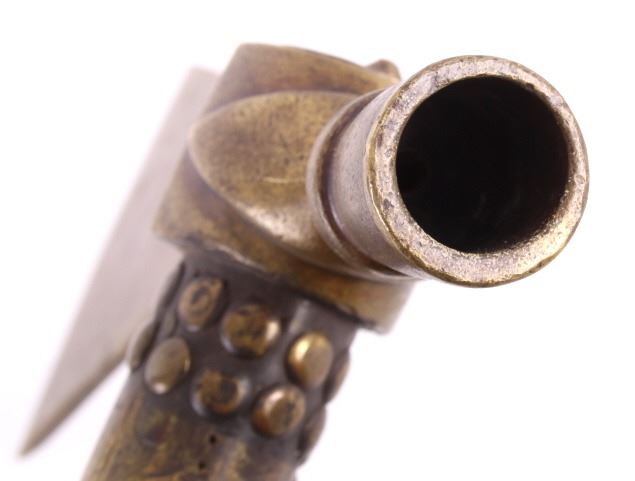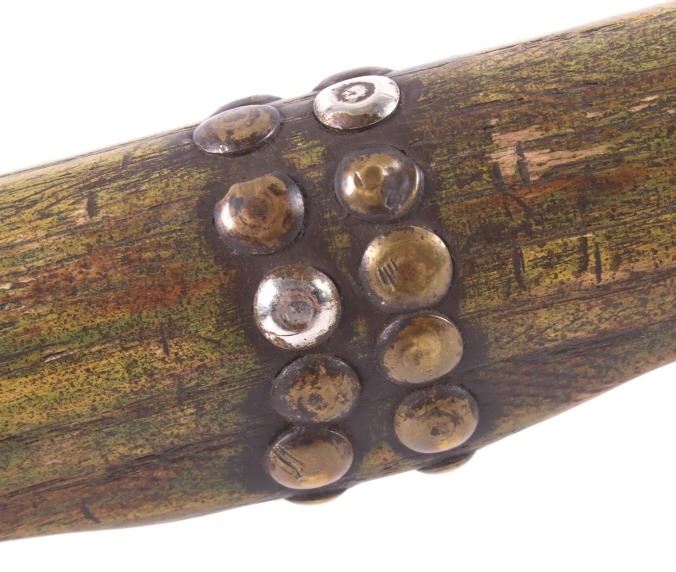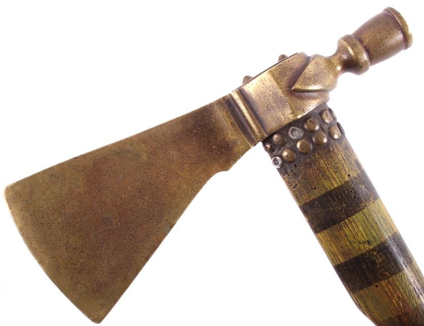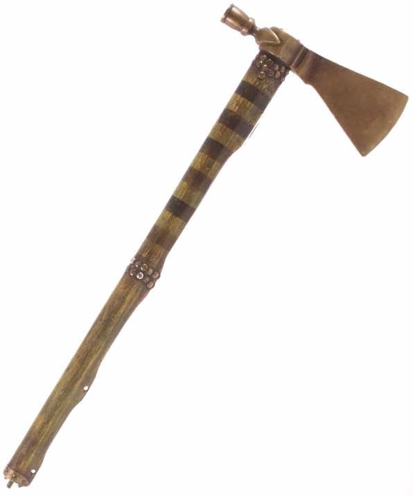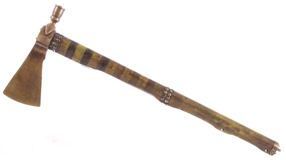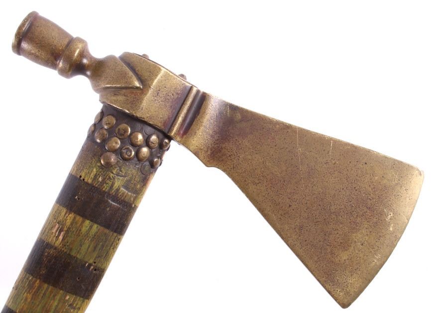 The lot features a solid brass pipe tomahawk war club head with hard wood haft being adorned with black and green ocher mineral pigment paint and attributed to being from the Northern Plains Native American Indians. The piece shows a solid brass head with pipe bowl having a nice even patina from age and use. The haft appears to be an oak construction with a dark green and banded black ocher mineral pigment dye along with various file branding and two bands of brass covered iron tacks The head appears to have an older early age casting with the haft's age possibly being a later addition. The tip of the haft shows a copper wrap with copper smoking tip and the eye hole is closed off with a copper studded plate. The tomahawk measures 23 3/8" long, and 9" wide across the head. The piece was previously listed and sold by Milestone Auctions of Ohio for over $1,200 in 2017. The current collector / owner finds the piece to have a significant age. Please review the pictures for condition, origin, age and originality. Previously was listed with a later addition of a beaded drop, which has since been removed to display in its more original form.