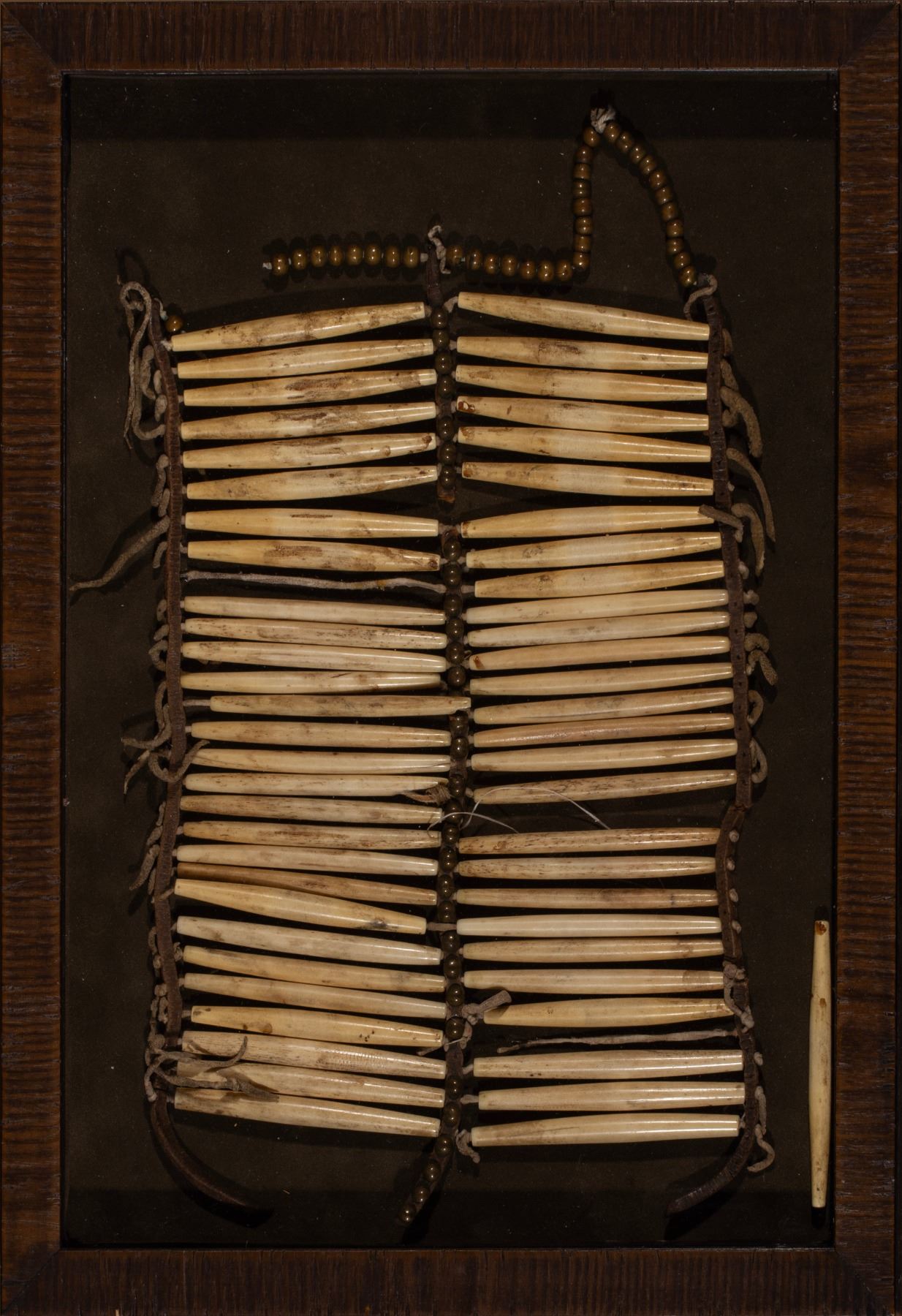 Northern Plains bone tube breastplate. Two sections of bone pipe tubes accented with brass tacks through the middle and brass beads along the bottom. Fastened with old harness leather. In an attrative shadow box, shows true enthnic wear as breastplate has some areas of construction issues.