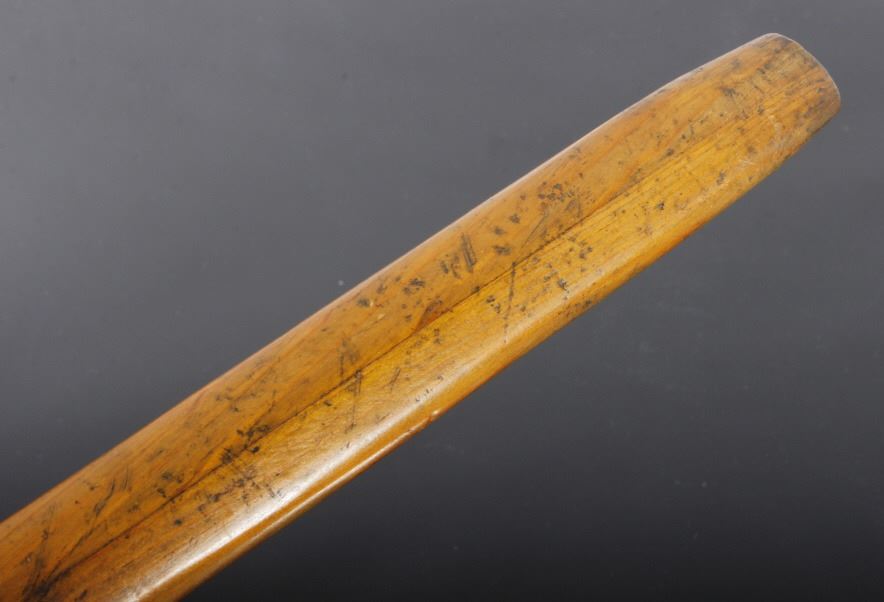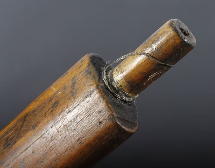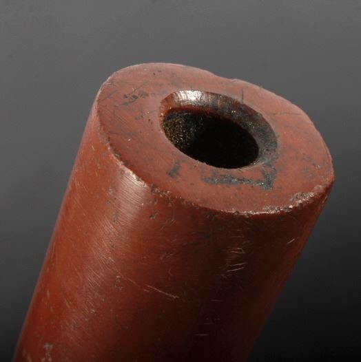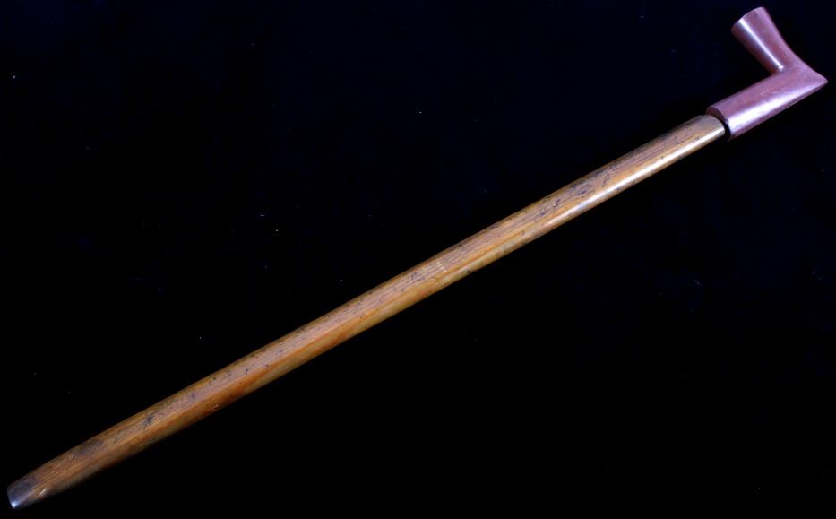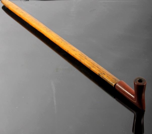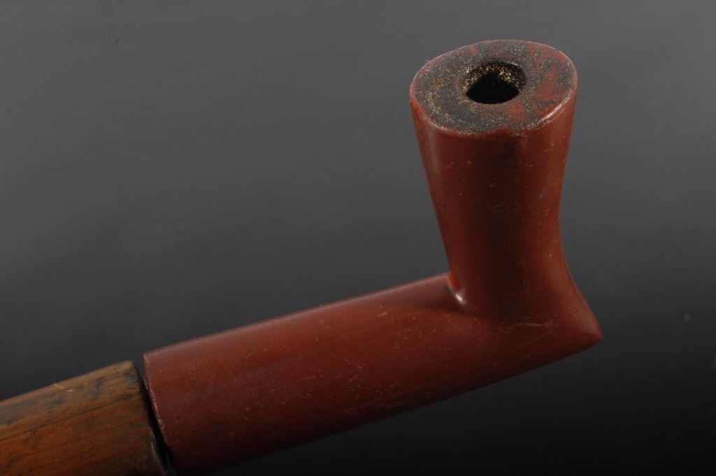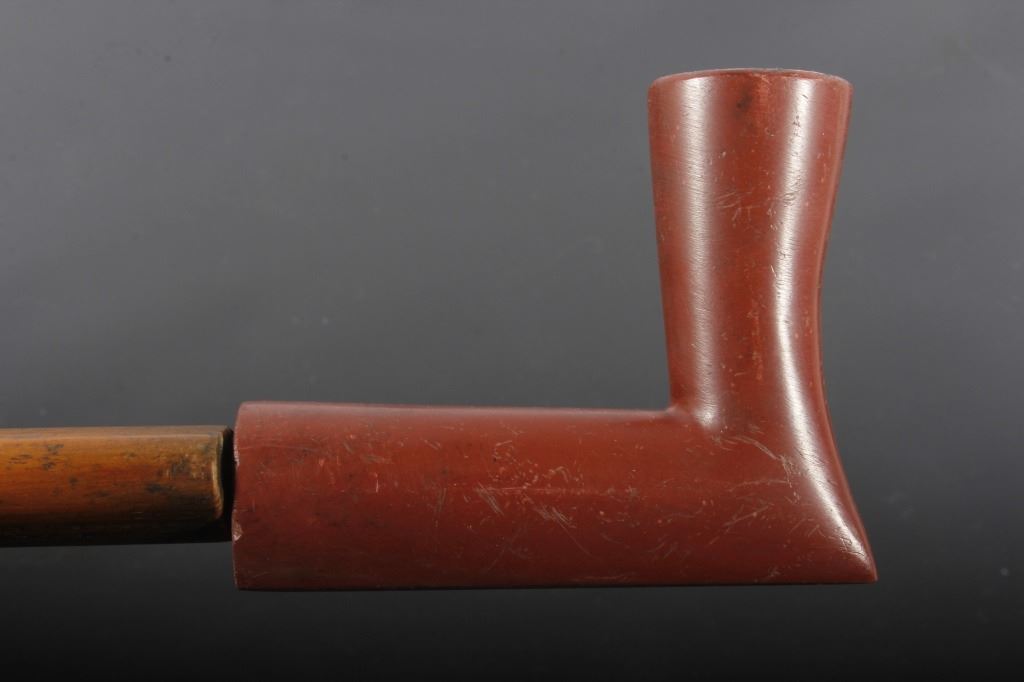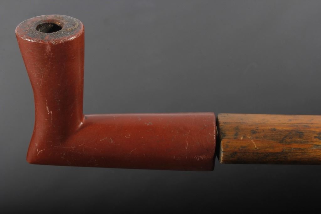 This is a wonderful Northern Plains Native American Indian catlinite pipestone elbow pipe bowl and carved wood stem from circa early 1900. The piece shows overall good condition and displays very well. The pipe and stem both show the correct patina and manufacture to reflect such an early age. Provenance: From a large Iowa Native American Artifact collection. Overall measures 21.5"L with a 3.25"L x 2 5/8"H x 1"D elbow pipe.