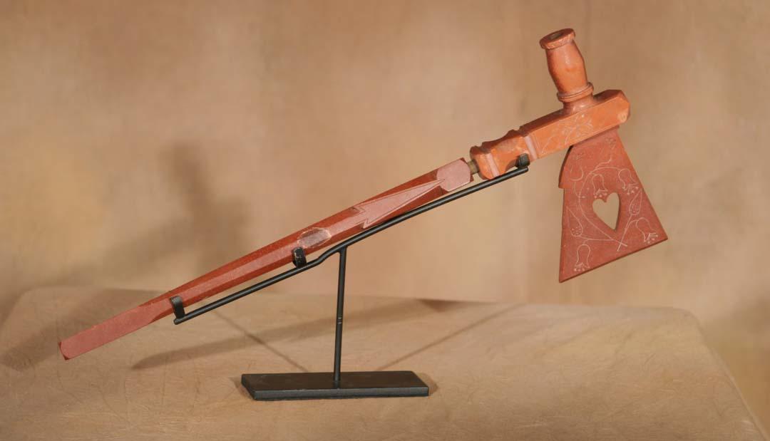 Northern Plains Catlinite Pipe. 17 ¼" x 7". Tomahawk form with nicely engraved head. Circa 1900. (est $300-500). Provenance: Ex-Santa Fe, NM., Estate. For condition reports please visit: www.auctioninsantafe.com/cr2011.pdf